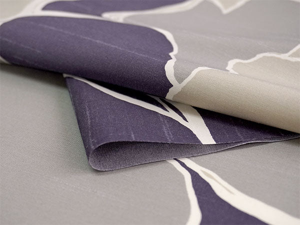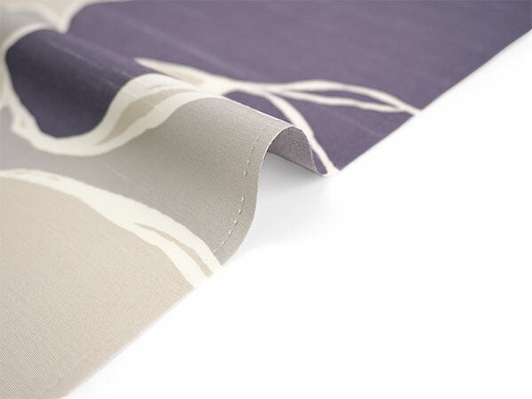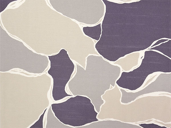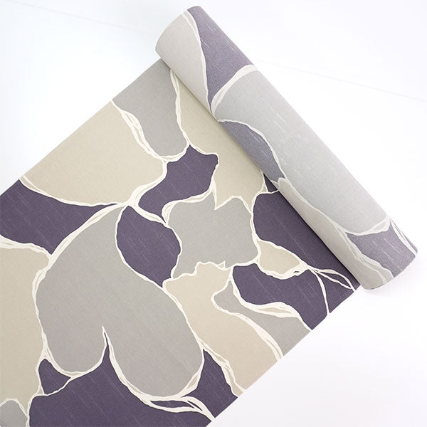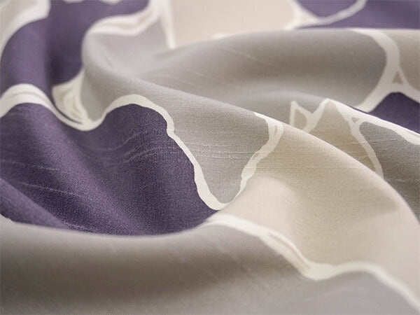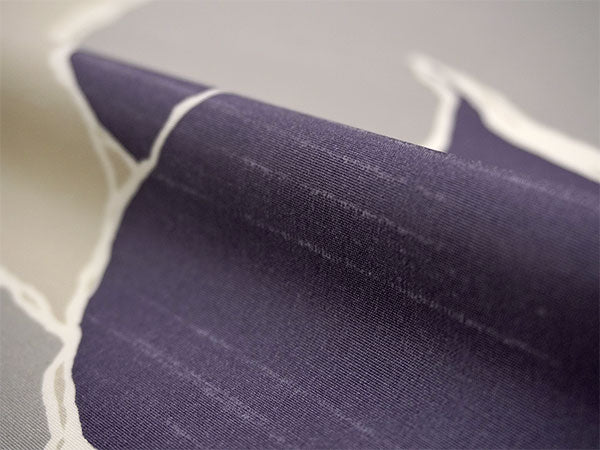 白みのベージュ、グレー、紺色で、ネコやハートの形がまぎれた迷彩のような遊び心ある抽象アートがデザインされています。 紬風の織の風合いと控えめな光沢感が程よく楽しめる柄ゆきです。 |
