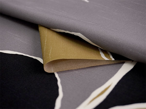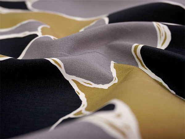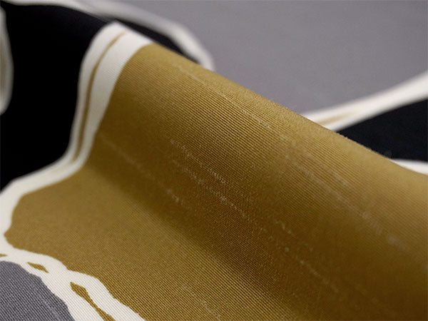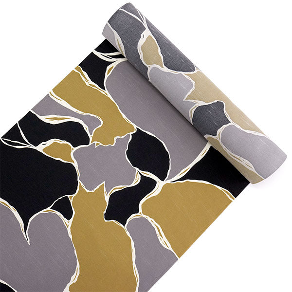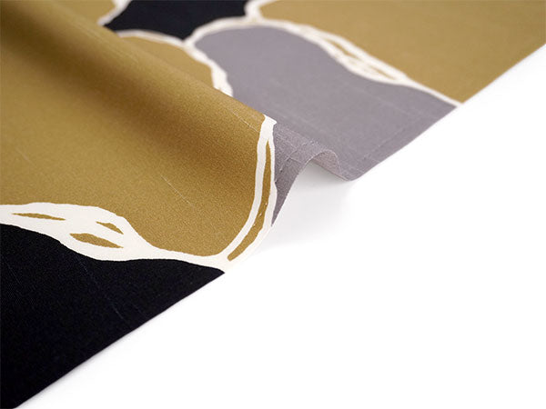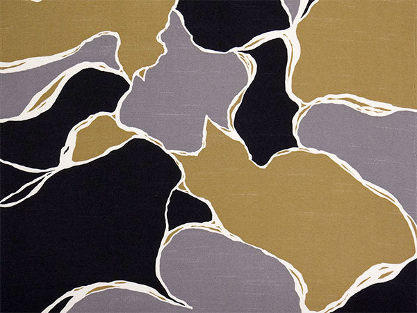 金銀彩のような渋黄と灰色に黒色で、ネコやハートの形がまぎれた迷彩のような遊び心ある抽象アートがデザインされています。 紬風の織の風合いと控えめな光沢感が程よく楽しめる柄ゆきです。 |