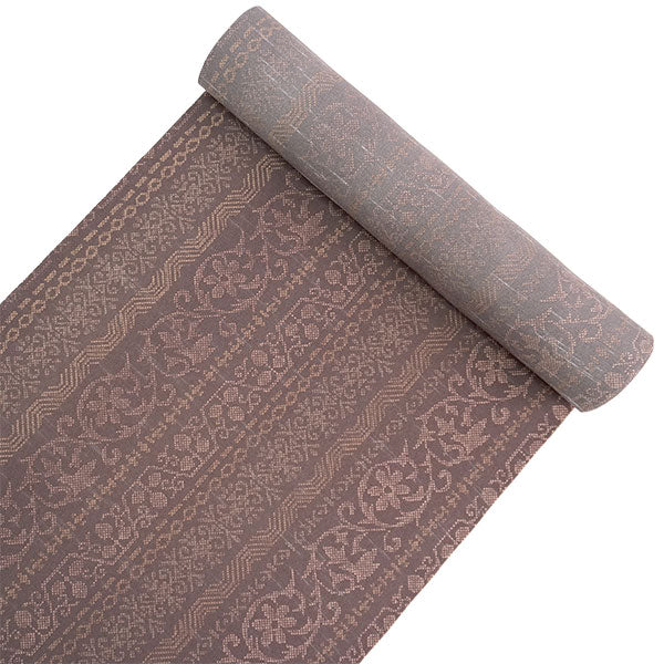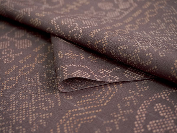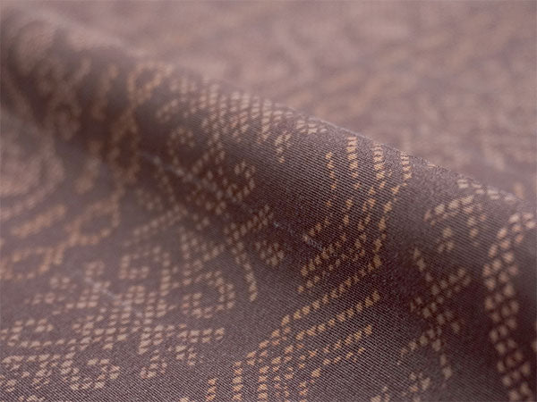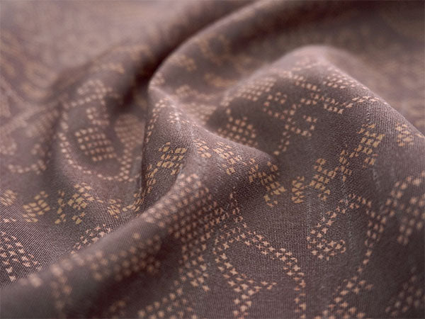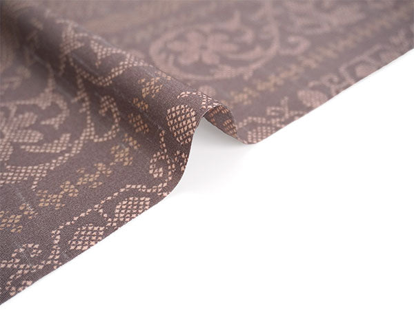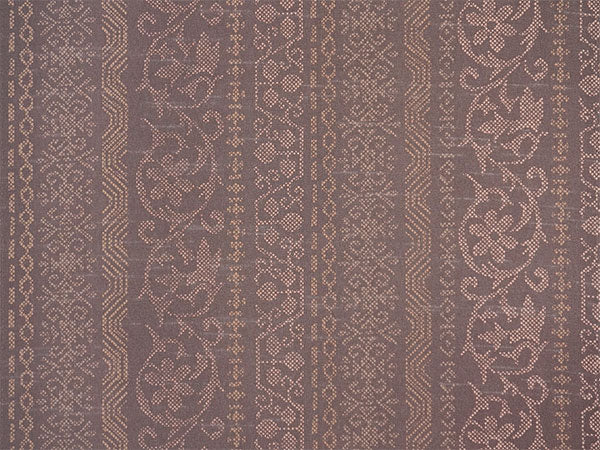 ココアブラウンの地に、エキゾチックな幾何学と花模様のリボンのような縞柄で、薄橙と薄桃の素朴な点描が個性的でお洒落。円熟感と快活さを併せ持つ柄ゆきです。 アンティーク感が紬風の織の風合いと控えめな光沢感に映えて引き立ちます。 |
