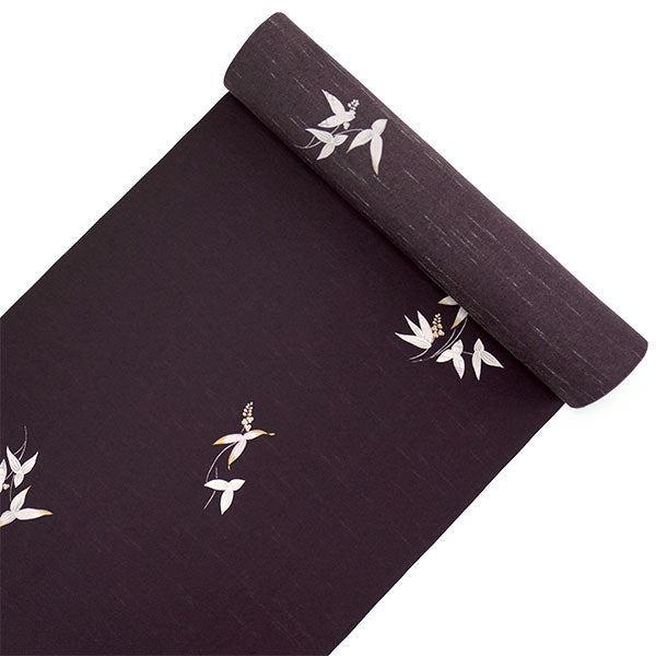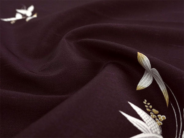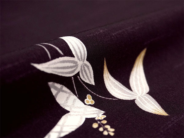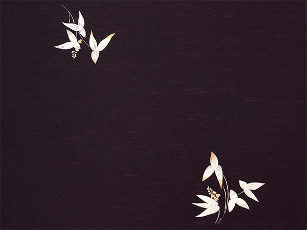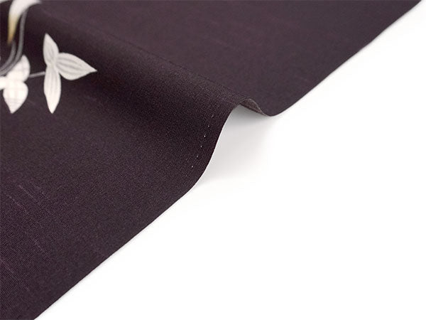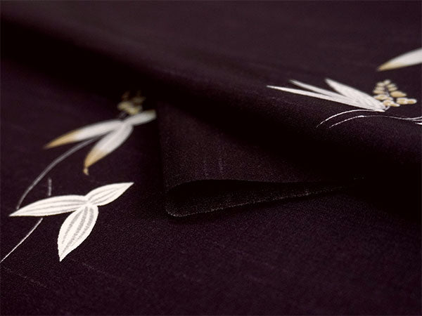 黒に近い深赤紫の地に、淡い色味の沢潟が品よく飛び柄で描かれています。金銀彩にも見える葉の彩色が、スマートで格調高い雰囲気に引き立てています。 濃色とシンプルな柄ゆきが品良い光沢感と紬の風合いを引き立て、生地感を一層楽しめます。 |