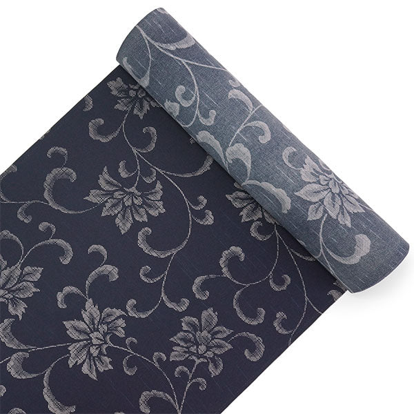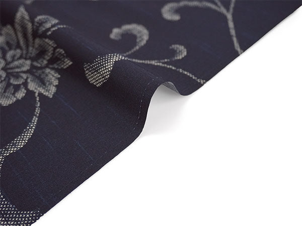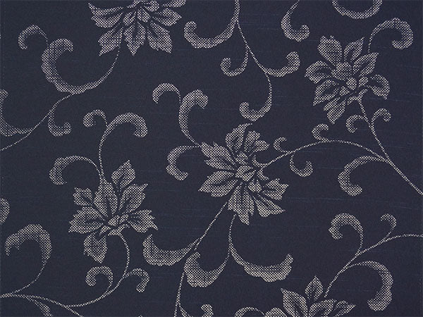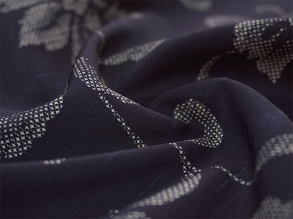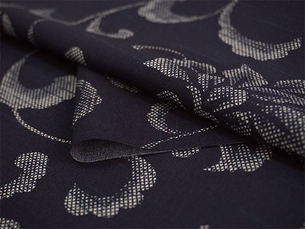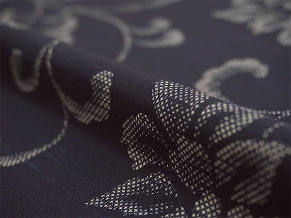 濃紺色の地に、素朴な点描で生成色の唐花柄が大きく伸びやかに配されています。2色のシンプルさながら繊細な濃淡が美しく、合わせるアイテムを選ばない使いやすい柄ゆきです。 濃色とシンプルな柄ゆきが品良い光沢感と紬の風合いを引き立て、生地感を一層楽しめます。 |