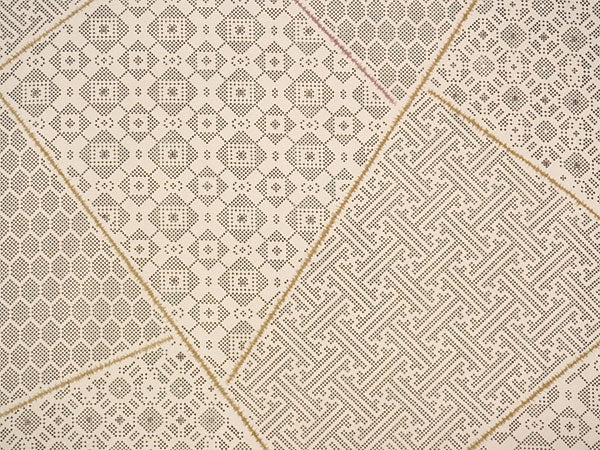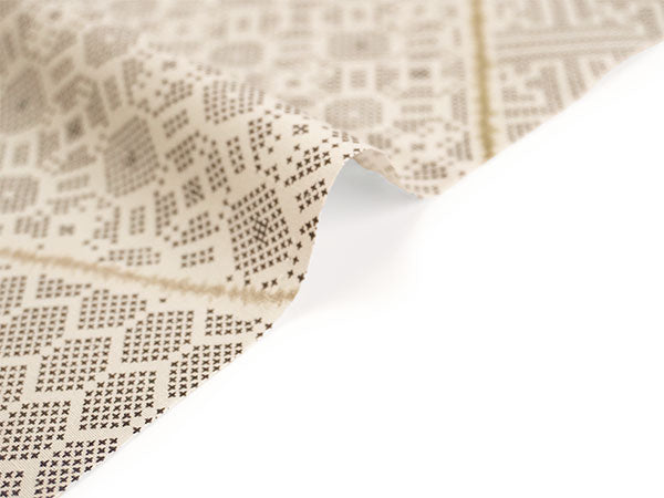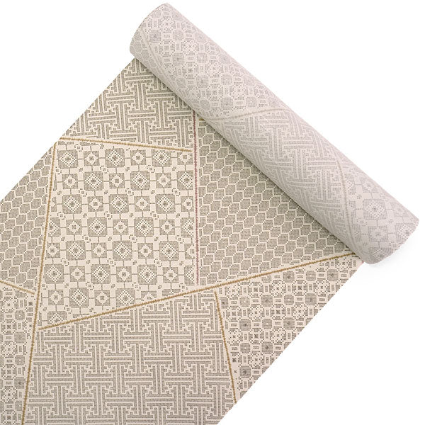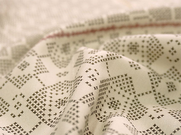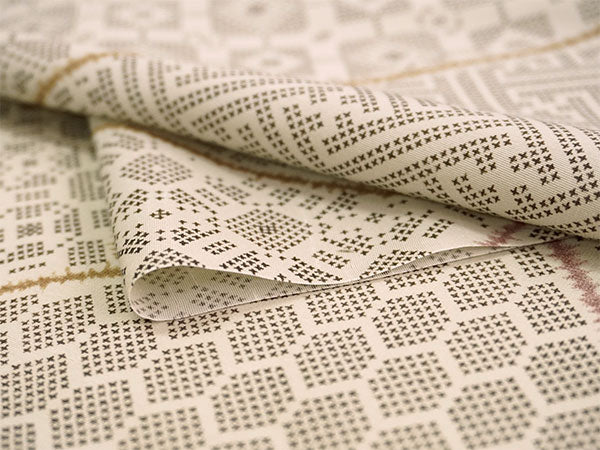 落ち着いた薄ベージュの地に、クロスステッチのような素朴な点描の古典柄が裂取りでデザインされています。亀甲、紗綾型、格天井や蜀江風の幾何学文様が、モダンな雰囲気で楽しめます。 紬風の織の風合いを程よく楽しめる柄ゆきです。 |