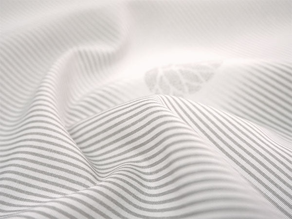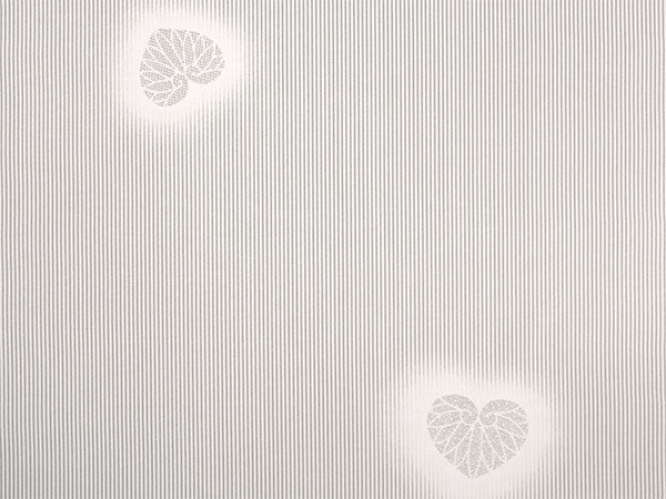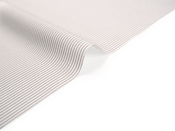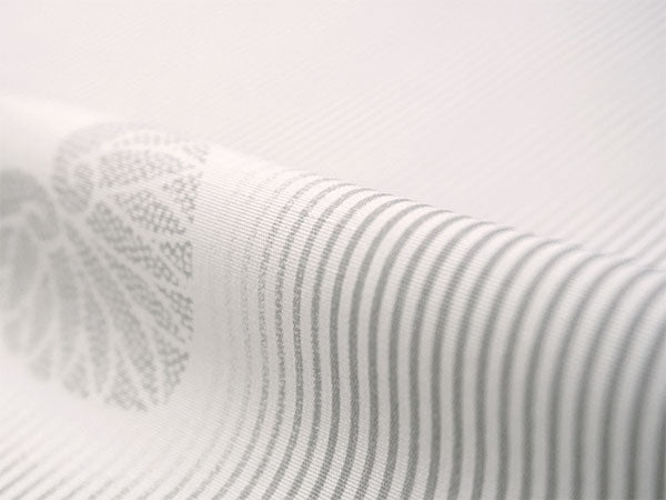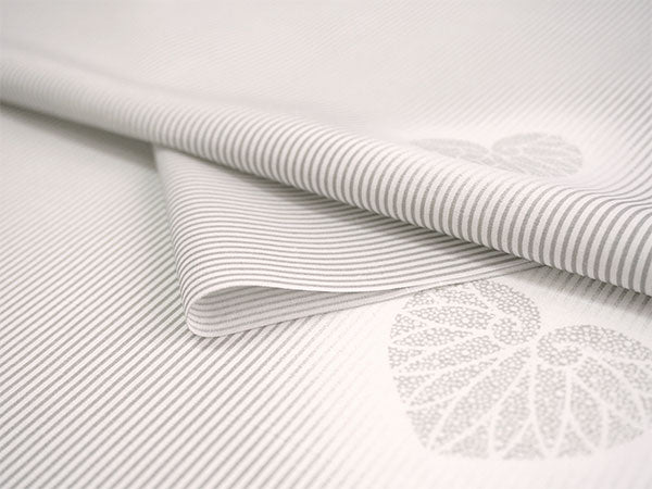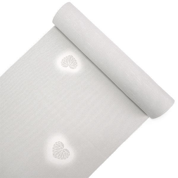 ごく淡い灰色の縞に、淡く光るような暈しの葵紋が飛び柄で散らされています。葵の葉は目を凝らせば霰や鱗、鮫などの小紋で描かれていて、シンプルながら意匠のこらされた柄ゆきです。 淡くシンプルな色柄は紬風の織の風合いに良く映え、素朴な生地感を楽しめます。 |