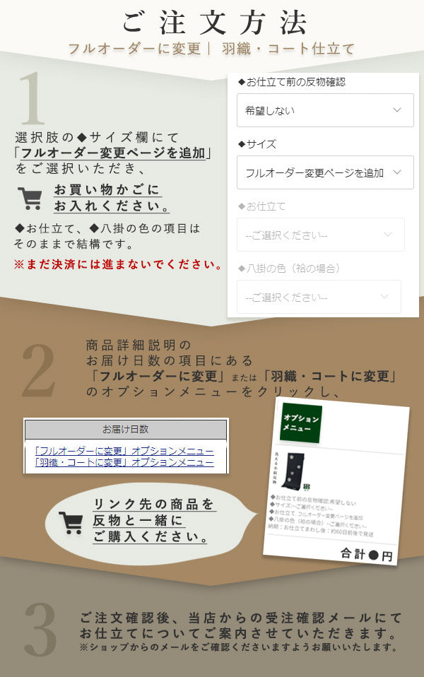 約60日前後でお仕立てしてお届けいたします。 ※御仕立て後の返品は承れかねますのであらかじめご了承ください。 お仕立ては5サイズ(XS・S・M・L・LL)から選べるセミオーダーです。 もしフルオーダーや羽織・コートのお仕立てをご希望の場合は、オプションを別途ご注文ください。 「フルオーダーに変更」オプションメニュー 「羽織・コートに変更」オプションメニュー |
