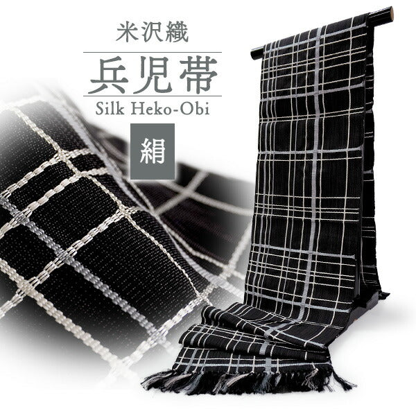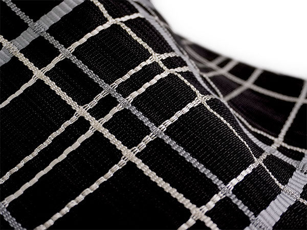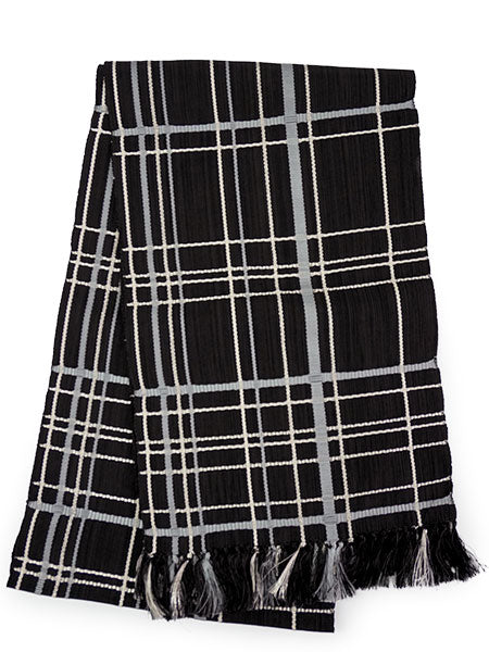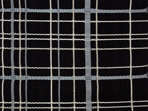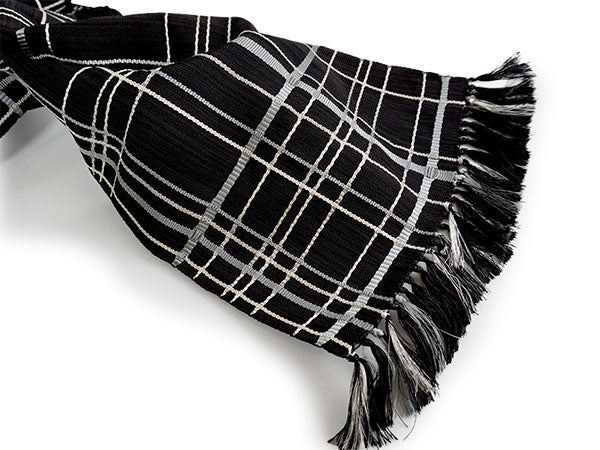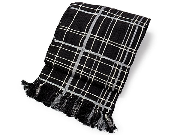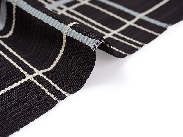 少し刷毛目のような濃淡がある黒地に、光沢感のあるグレーと銀糸で、マドラスチェックのような格子柄が織り出されています。