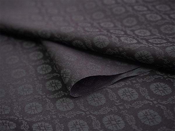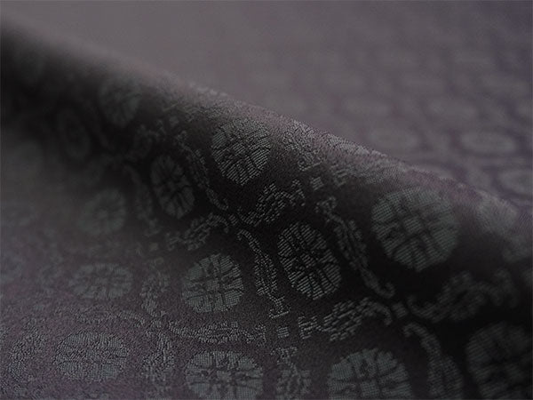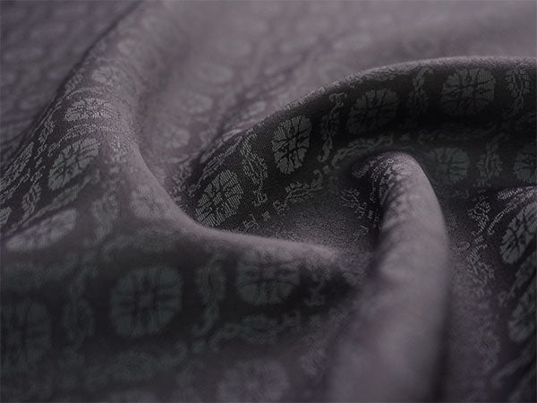 濃鼠色(暗めの紫みの灰色) 整然とした小葵地紋が品格を感じさせる雰囲気です。 深みのある地色の古典柄と上品な光沢感が相まって、品よく大人びた魅力があります。 しっかり厚みのある柔らかな生地感で、手触りなめらかな色無地です。 |
