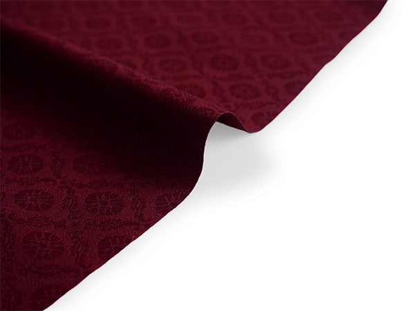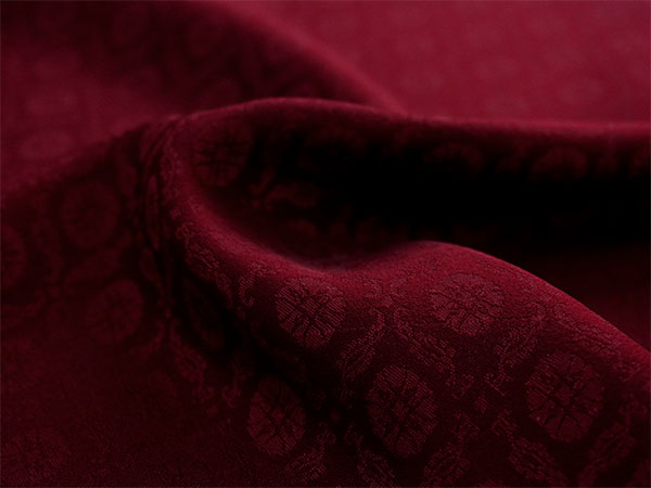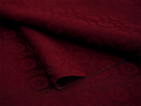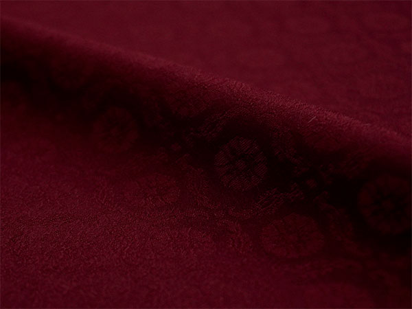 深紅色 整然とした小葵地紋が品格を感じさせる雰囲気です。 深みのある地色の古典柄と上品な光沢感が相まって、品よく大人びた魅力があります。 しっかり厚みのある柔らかな生地感で、手触りなめらかな色無地です。 |