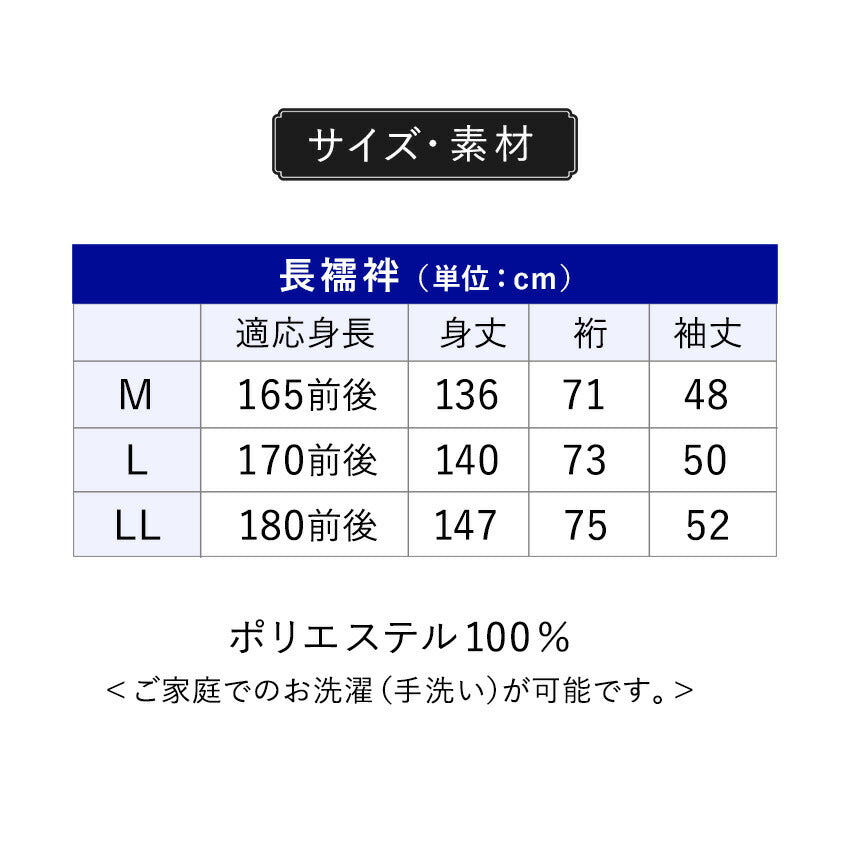 ●Mサイズ<対応身長:165cm前後> 身丈:136cm、裄:71cm、袖丈:48cm ●Lサイズ<対応身長:170m前後> 身丈:140cm、裄:73cm、袖丈:50cm ●LLサイズ<対応身長:180cm前後> 身丈:147cm、裄:75cm、袖丈:52cm |