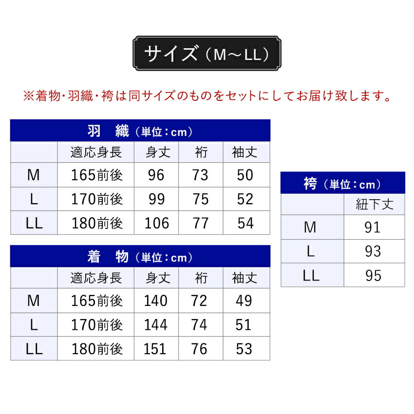 ※羽織・着物・袴は同サイズのものをセットにしてお届けいたします。 ●Mサイズ<対応身長:165cm前後> 【着物】 身丈:140cm、裄:72cm、袖丈:49cm 【羽織】 身丈:96cm、裄:73cm、袖丈:50cm 【袴】 紐下丈:91cm ●Lサイズ<対応身長:170m前後> 【着物】 身丈:144cm、裄:74cm、袖丈:51cm 【羽織】 身丈:99cm、裄:75cm、袖丈:52cm 【袴】 紐下丈:93cm ●LLサイズ<対応身長:180cm前後> 【着物】 身丈:151cm、裄:76cm、袖丈:53cm 【羽織】 身丈:106cm、裄:77cm、袖丈:54cm 【袴】 紐下丈:95cm |