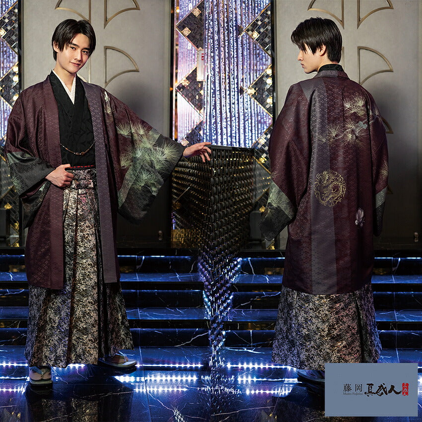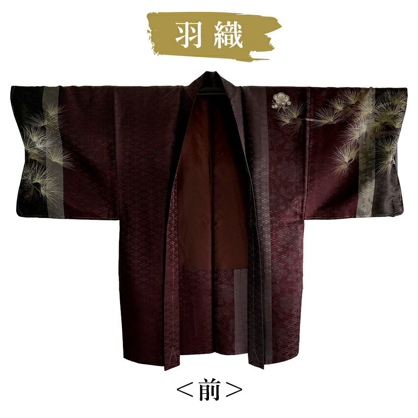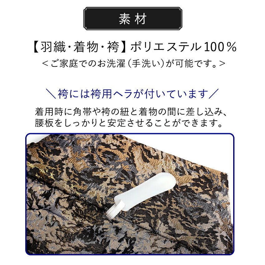【3点セット】 ・羽織(臙脂地 松柄) ・着物(黒地 七宝花菱地紋) ・袴(ゴールド地 幾何学柄) ※襦袢・角帯・羽織紐などは別売りとなります。 |