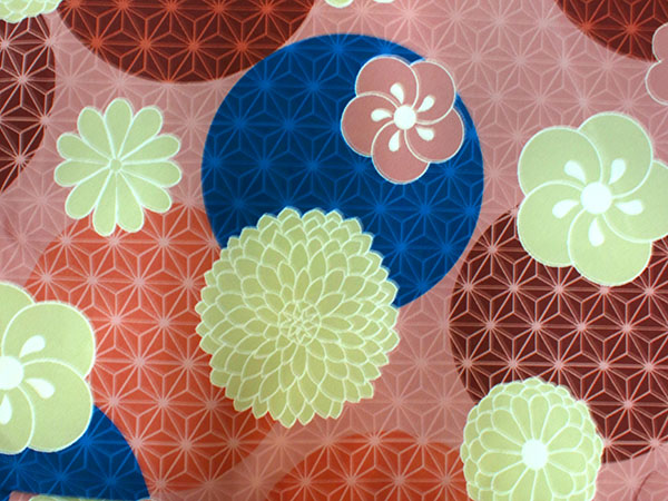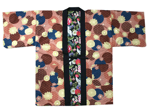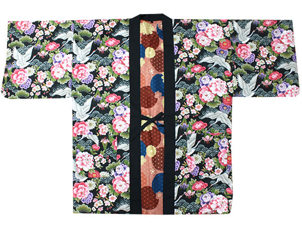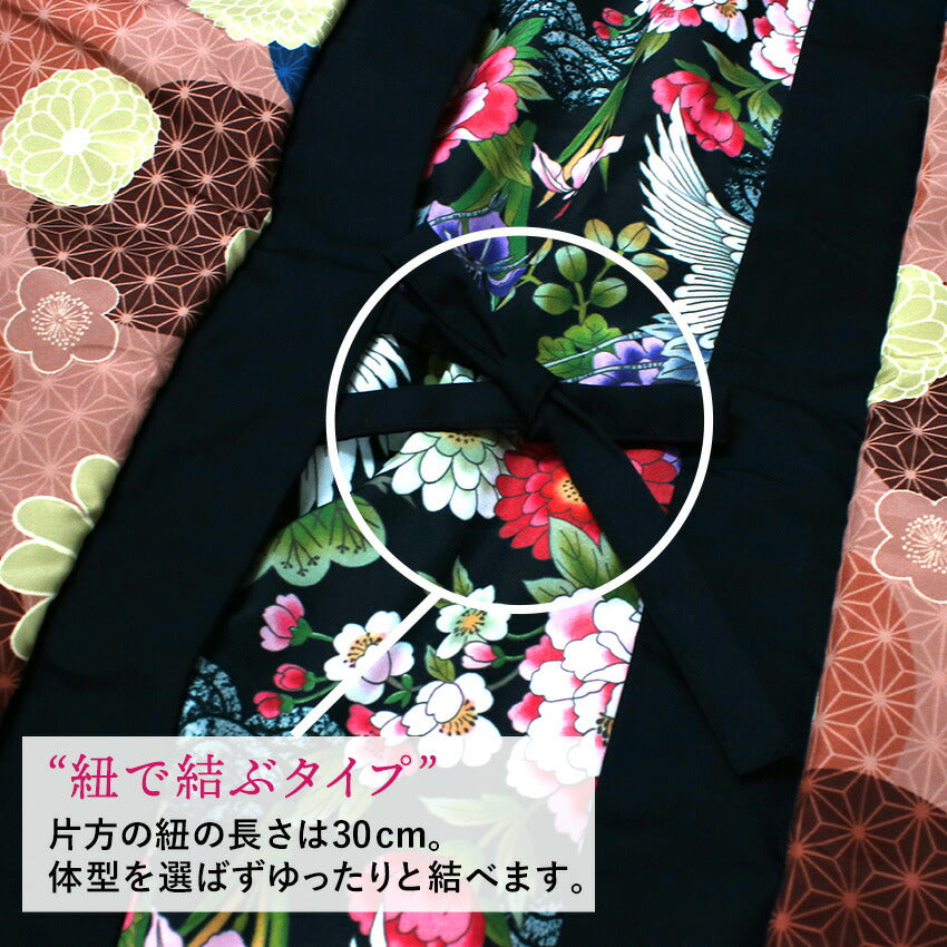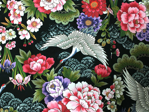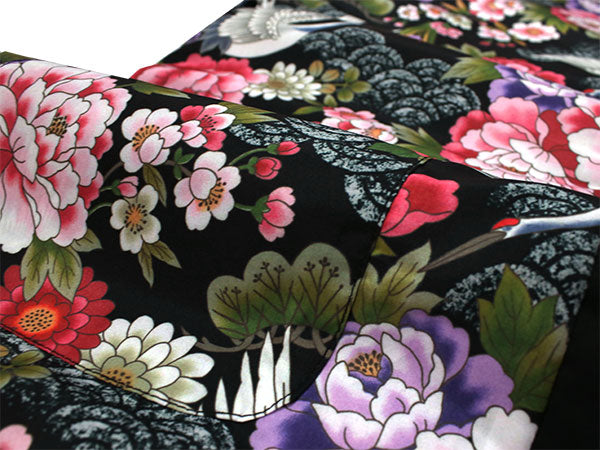 | 黒地鶴に吉祥花×渋ピンク地麻の葉丸紋と花紋 |