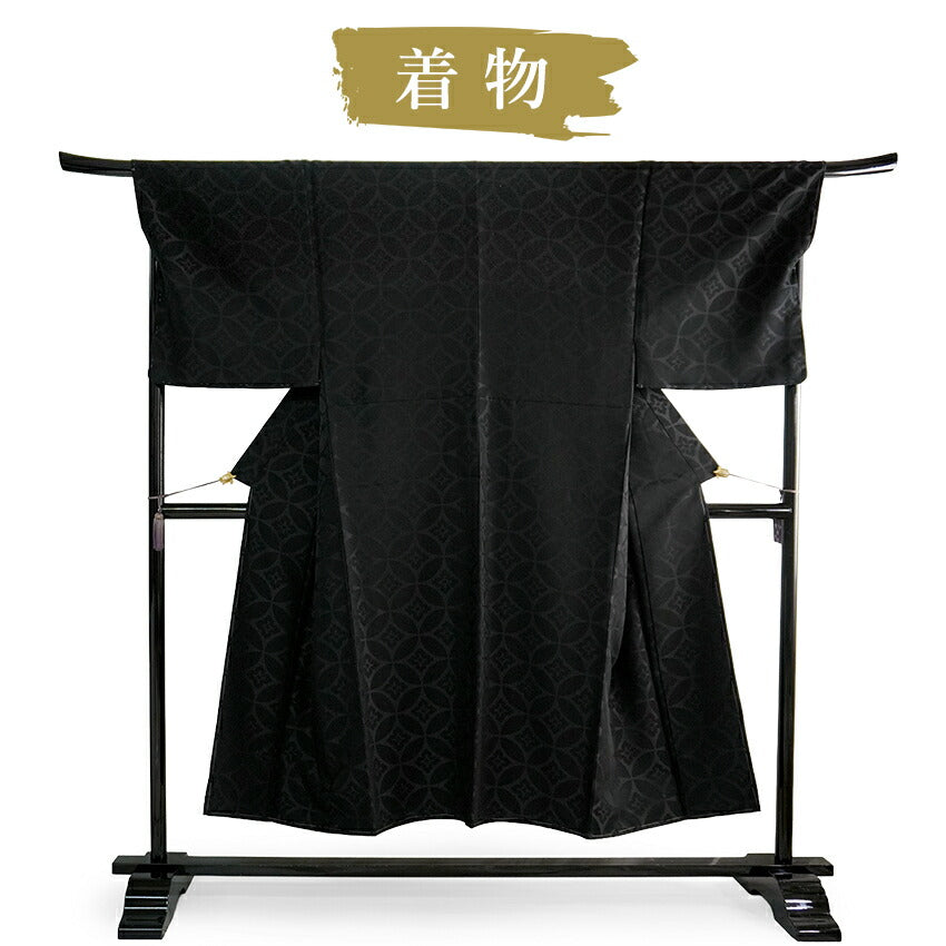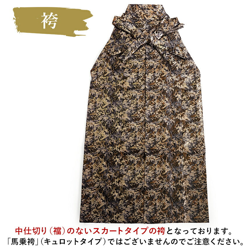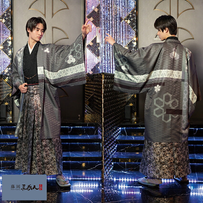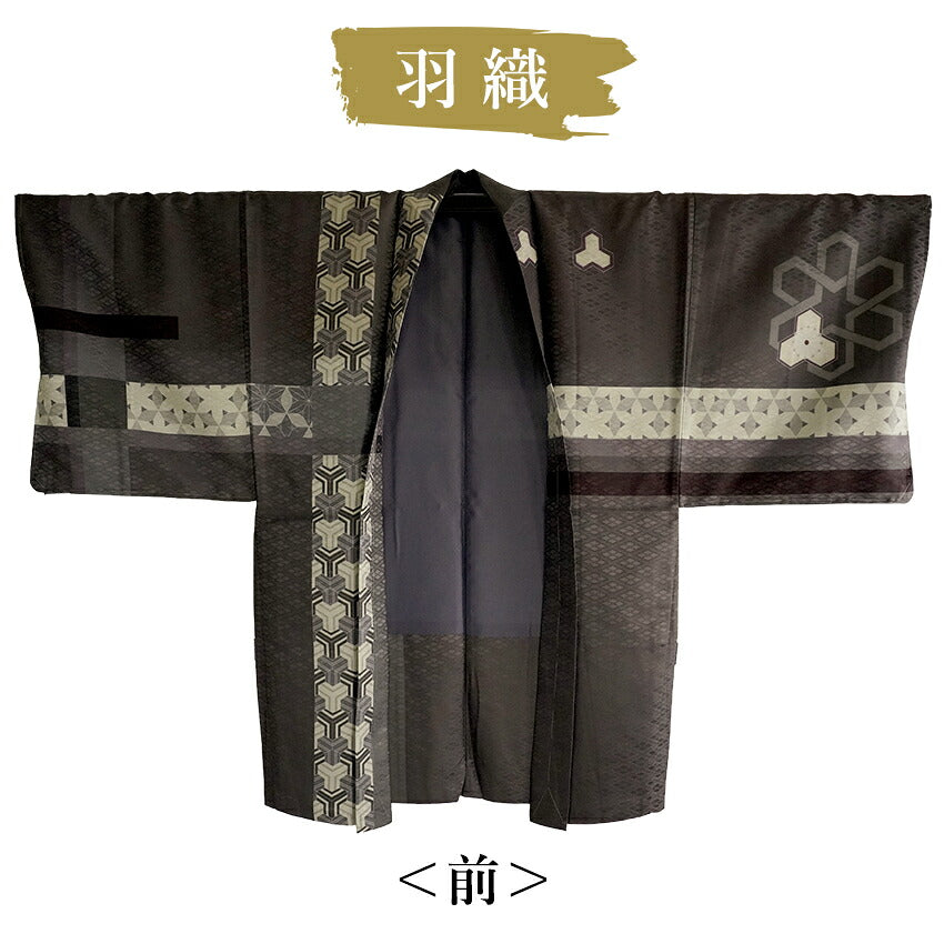【3点セット】 ・羽織(カーキ地 短冊幾何学柄) ・着物(黒地 七宝花菱地紋) ・袴(ゴールド地 幾何学柄) ※襦袢・角帯・羽織紐などは別売りとなります。 |