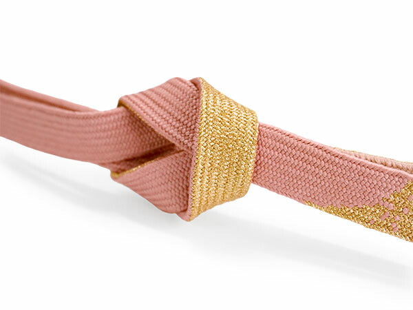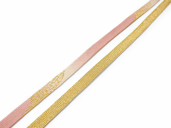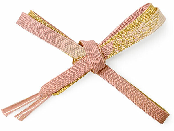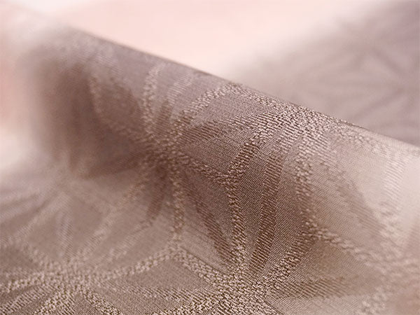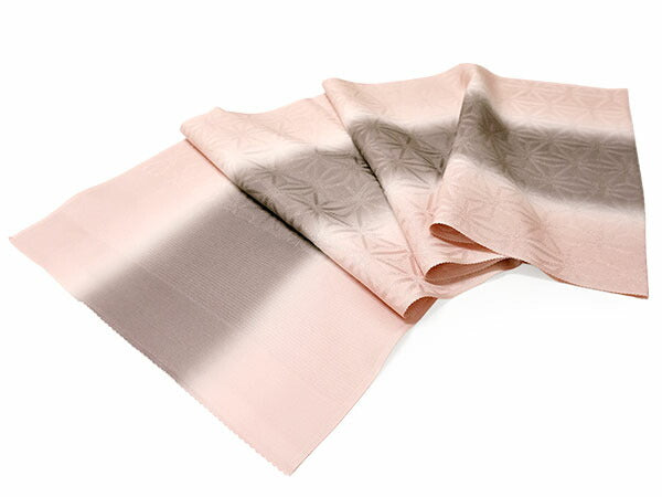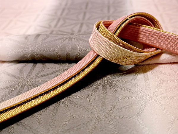 【帯揚げ】 麻の葉地紋 薄ピンク×灰茶(縦暈し) 【帯締め】 平組 薄桃×オフホワイト(裏面ゴールド) |