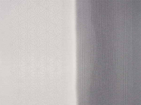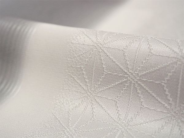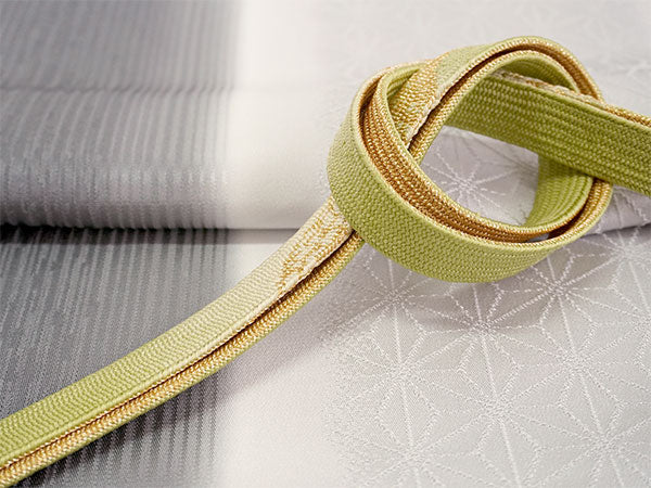 【帯揚げ】 麻の葉・滝縞地紋 灰色(縦暈し) 【帯締め】 平組 薄黄緑×オフホワイト(裏面ゴールド) |