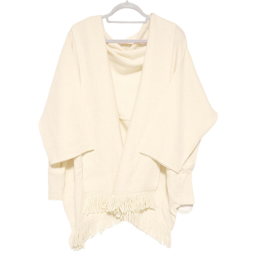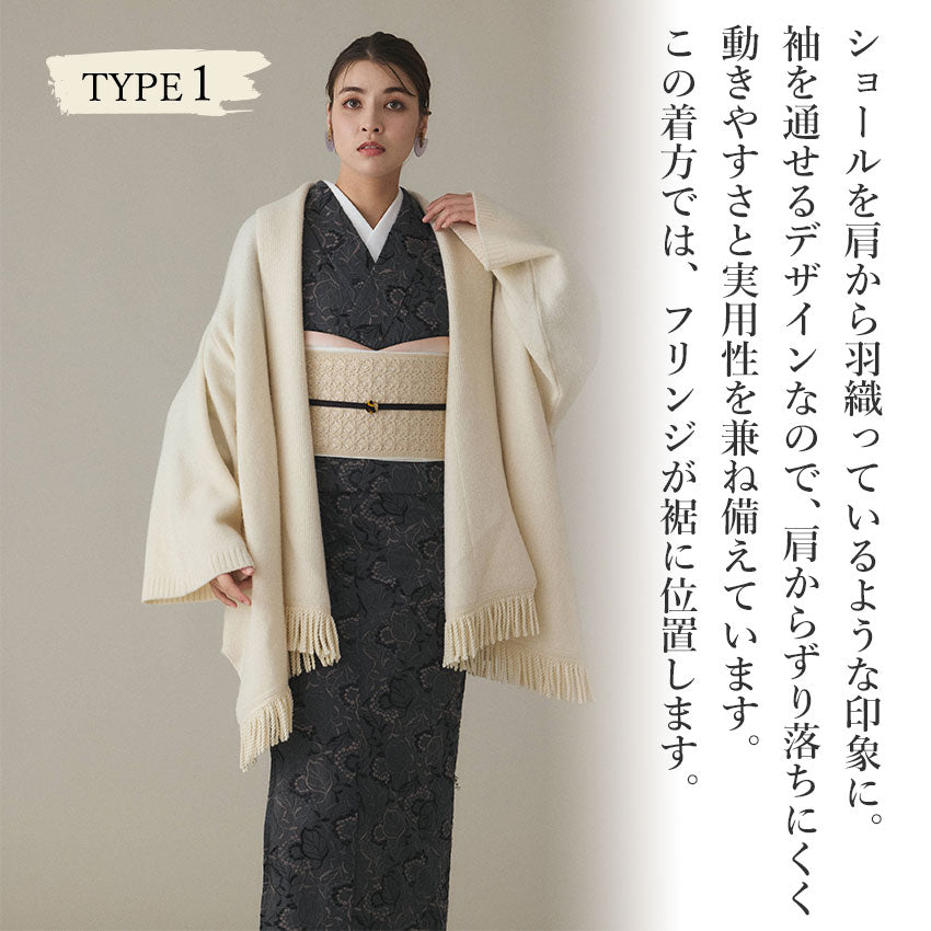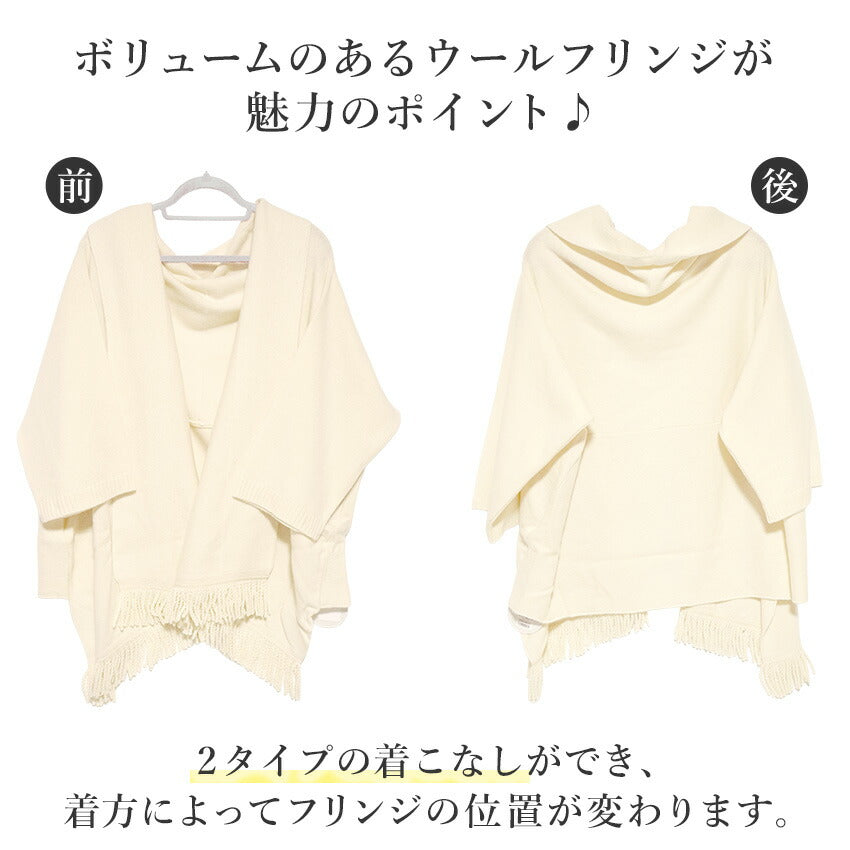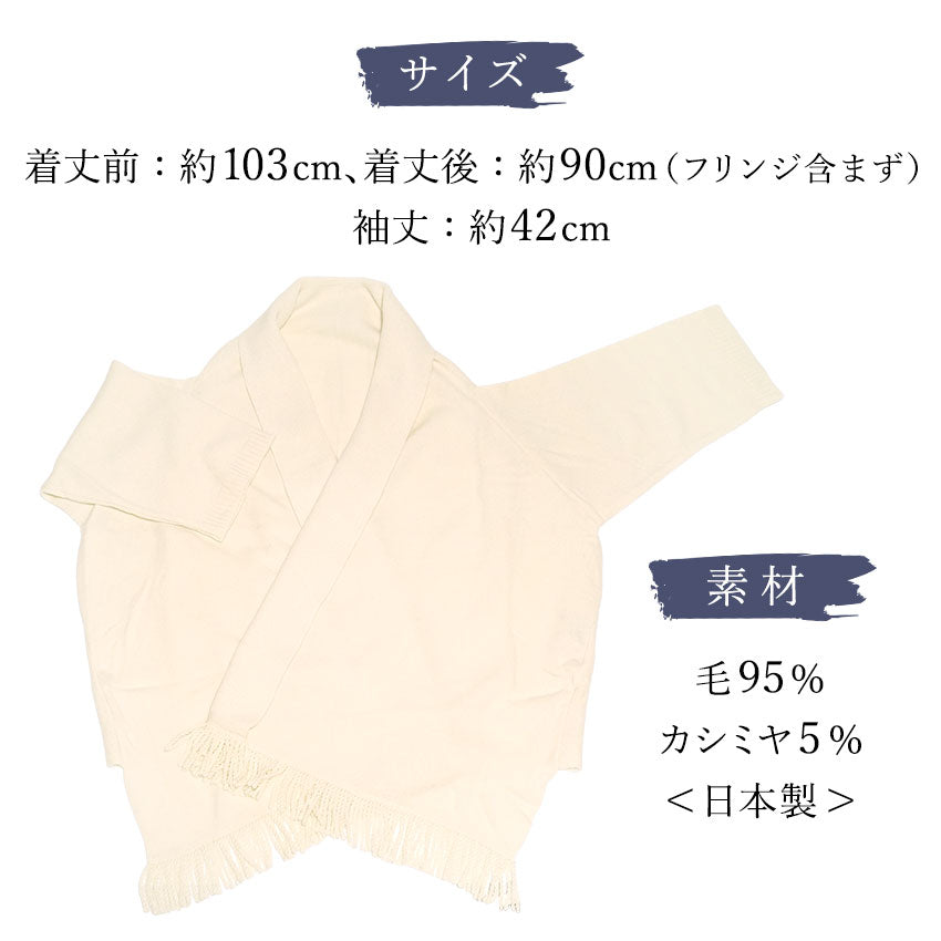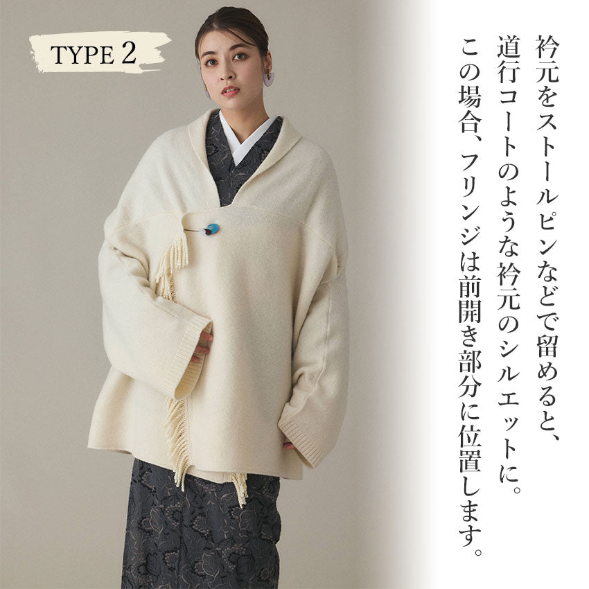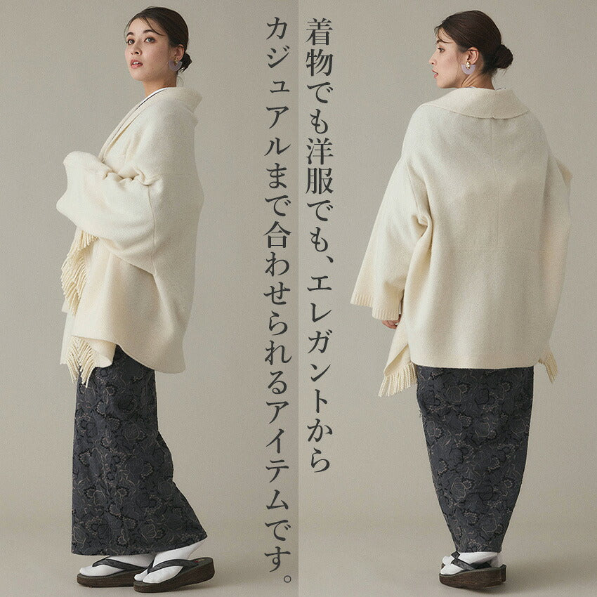フリンジショールカーディガン ホワイト YOUTOWA 着こなし2way!ショール風に道行風に、サッと羽織れる薄手ニットカーディガン