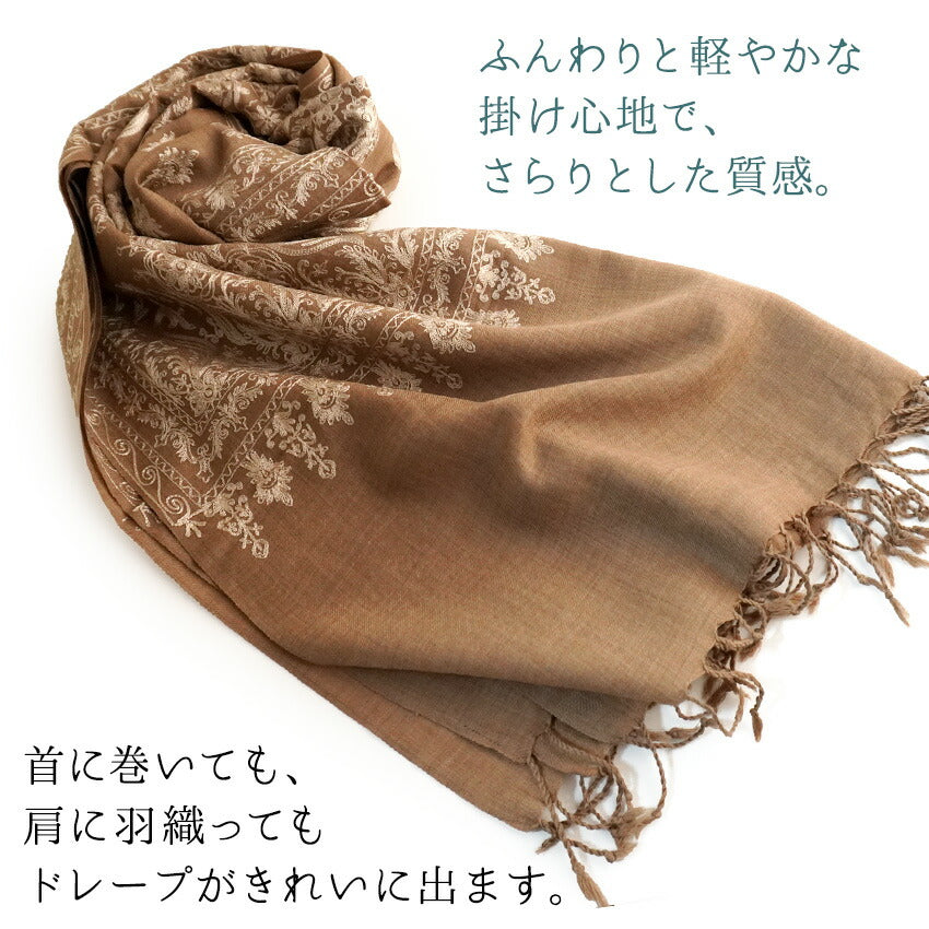大判の約70cm×約200cmサイズは、首に巻いても肩に羽織っても美しく、ドレープがきれいに出ます。