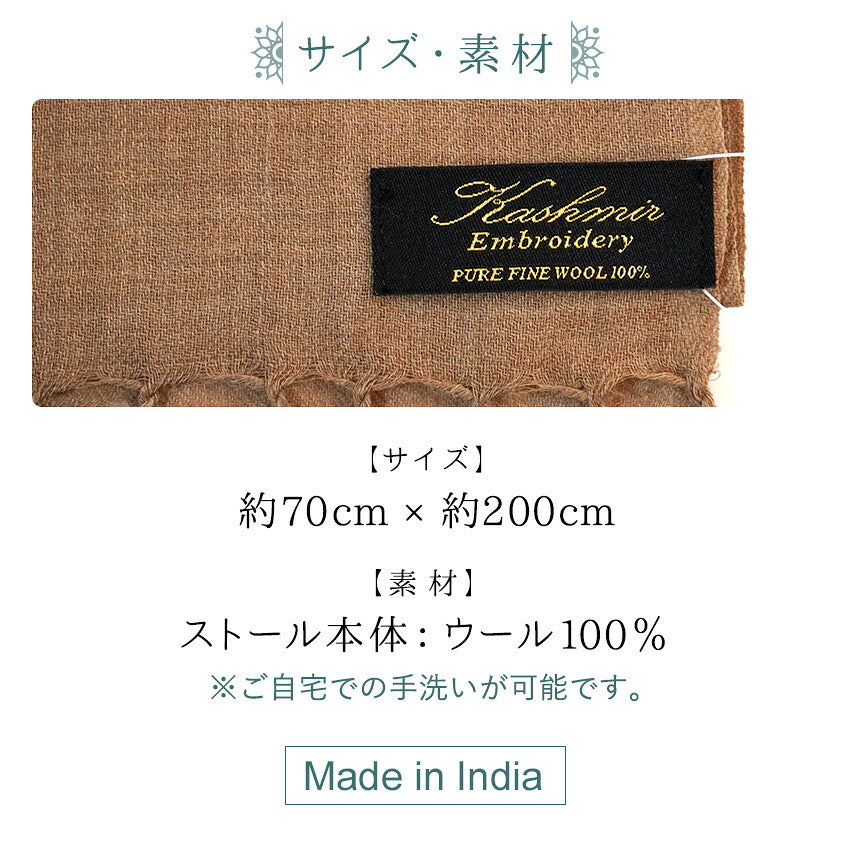 ストール本体:ウール100% ※手洗いが可能です。 Made in India(インド製) |