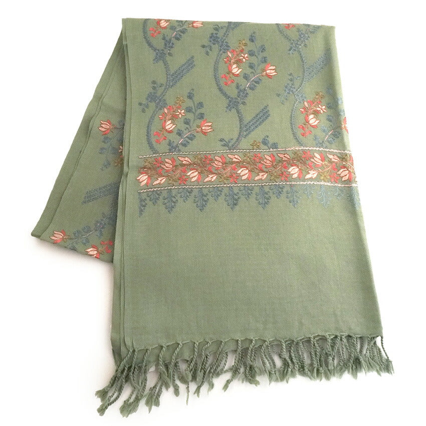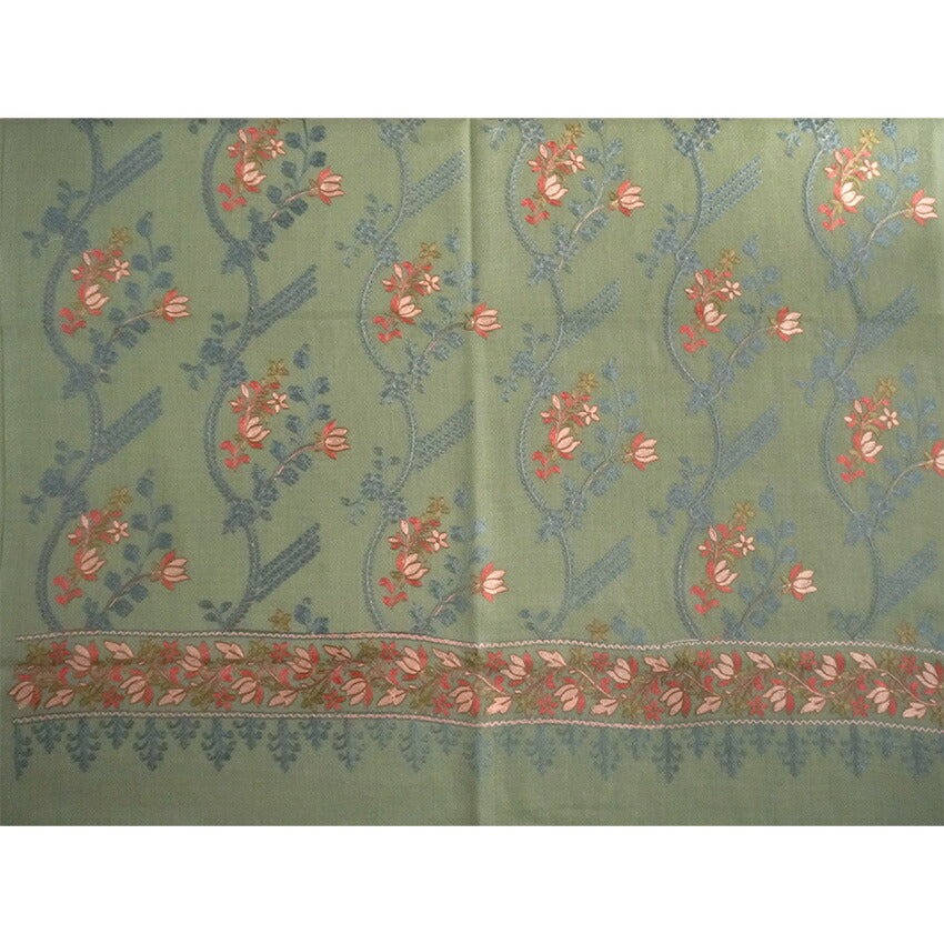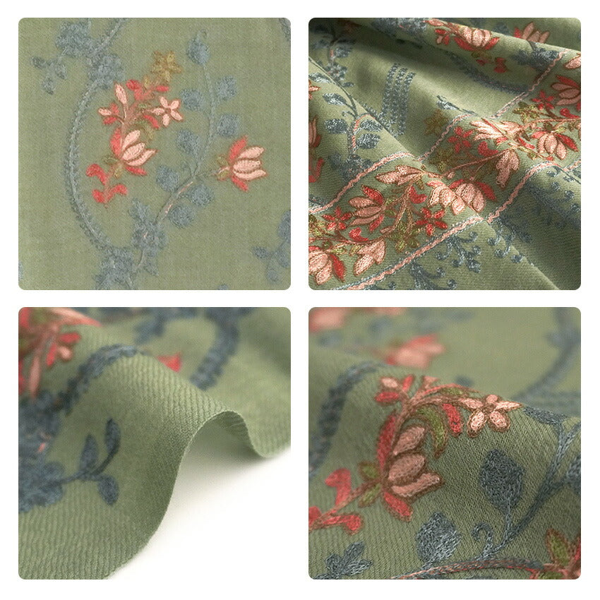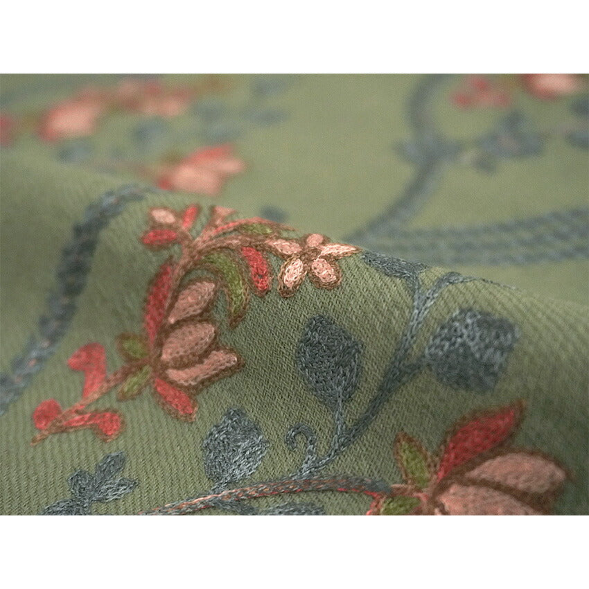 | グリーン地に更紗柄のピンク・ブルー刺繍 |