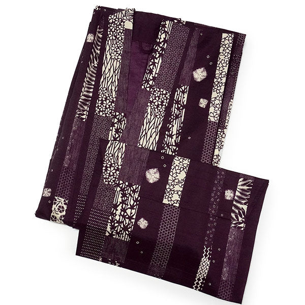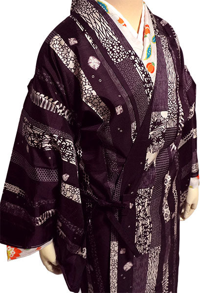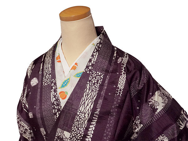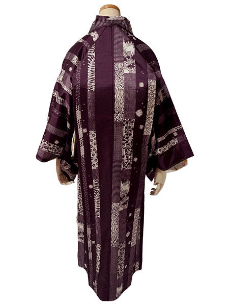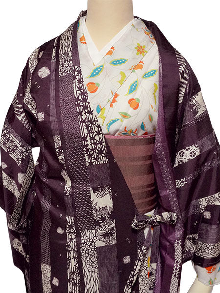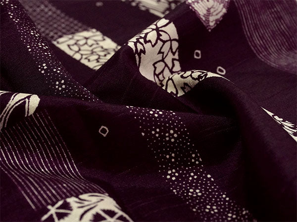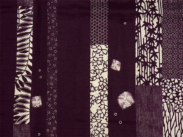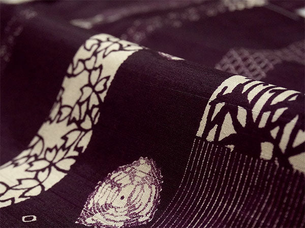 赤みの深紫地に生成色で、版画のような味のあるタッチの、桜、もみじ、かごめ、梅鉢などが描かれています。様々な柄の短冊を組み合わせて縞にしたような趣が面白く、古風な可愛らしさのあるコートです。 薄手でザラリとした光沢とシャリ感があり、横向きの織りの風合いがある生地感です。 |
