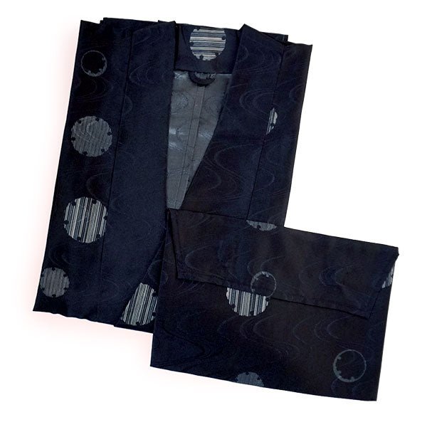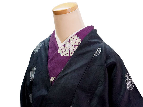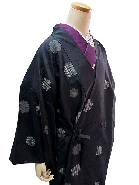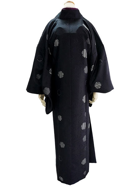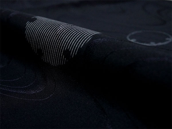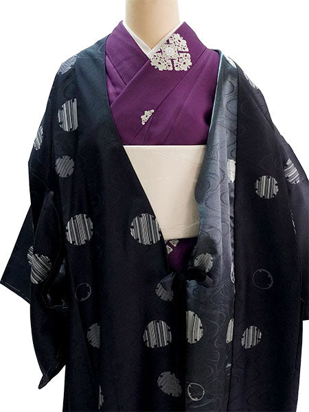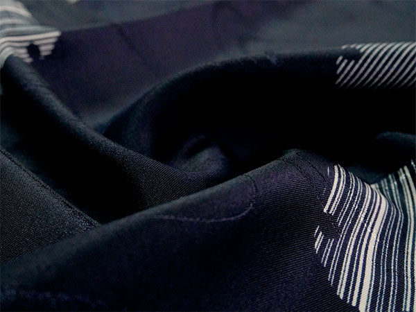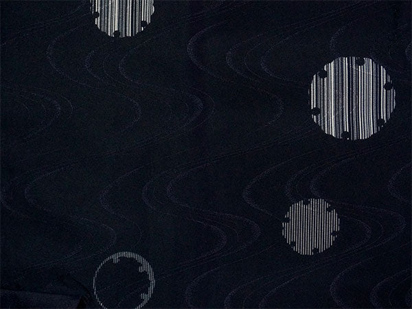 黒に近い濃藍色の地に、流水地紋が施され、白の雪輪取りの縦縞が散らされています。程よい柄感が上品で、使いやすい雰囲気のコートです。 やや光沢感がある生地感です。 |