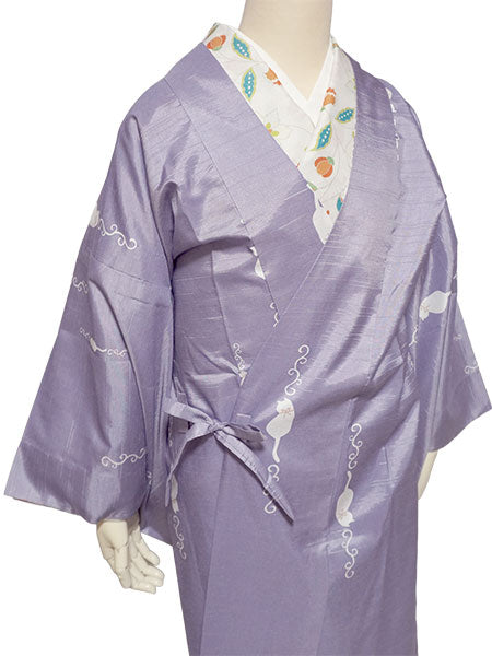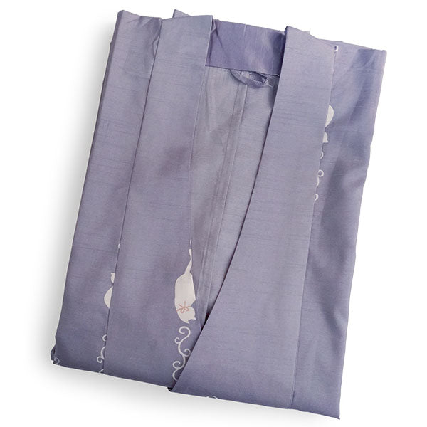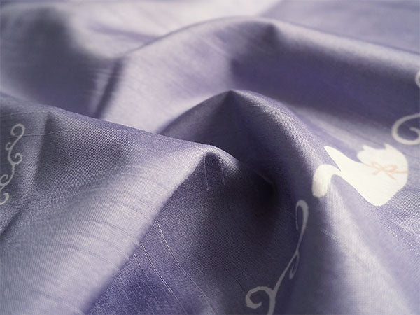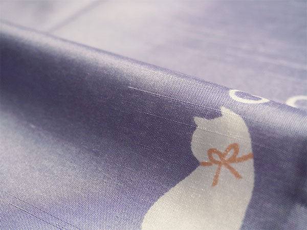 くっきりした光沢感の藤色の地に、小さな白猫があしらわれています。よそ行きのリボンが愛らしく、雨のおでかけを心躍らせてくれます。 薄手でザラリとしたシャリ感があり、横向きの織りの風合いがある生地感です。 |