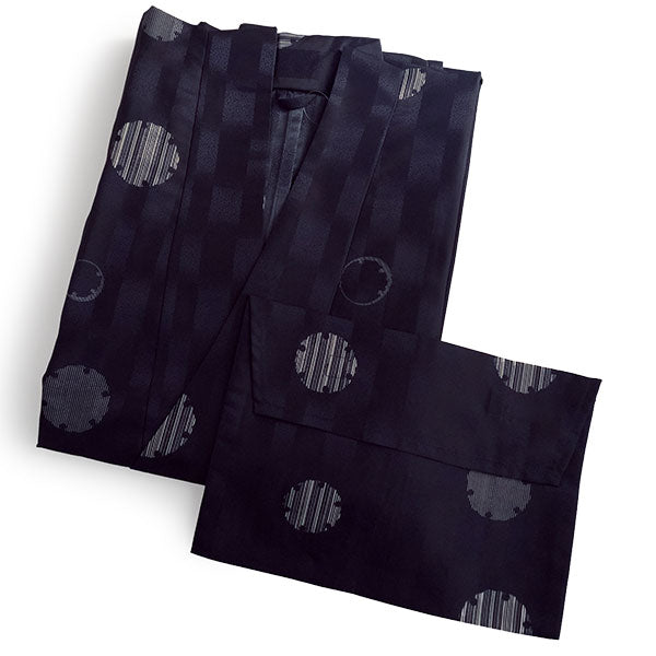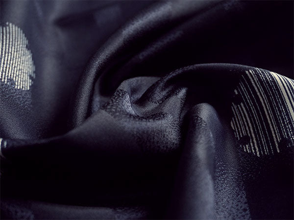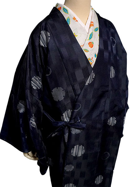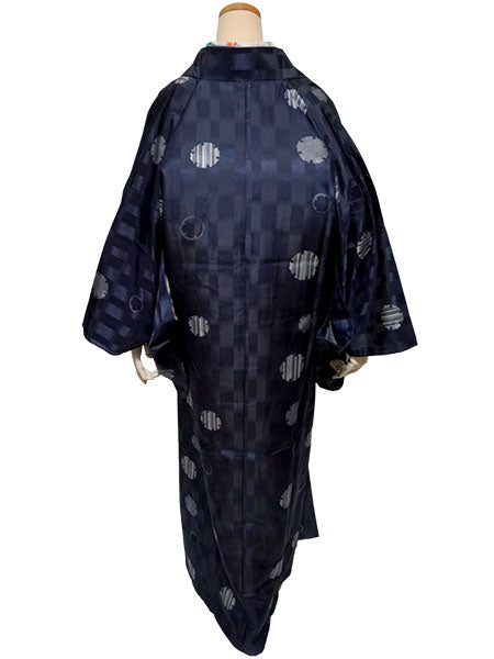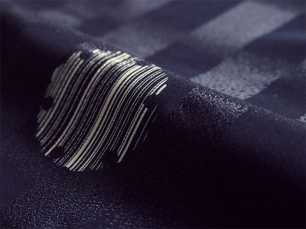 黒に近い濃紺色の地に、市松のような縞暈しの地紋と、白の雪輪取りの縦縞が散らされています。程よい柄感が上品で、使いやすい雰囲気のコートです。 滑らかでやや厚いサテンのような光沢感がある生地感です。 |