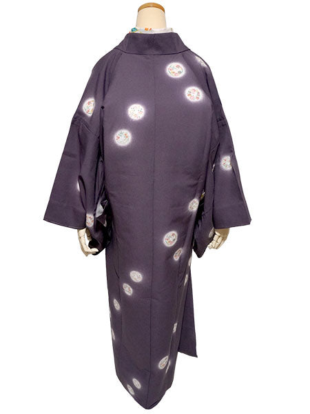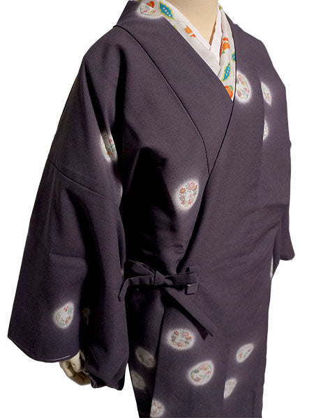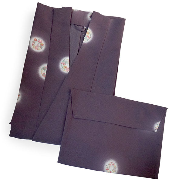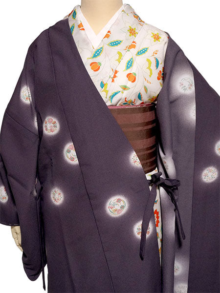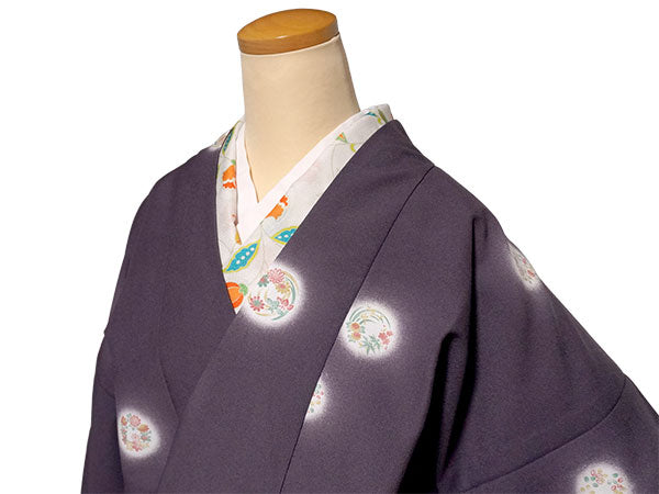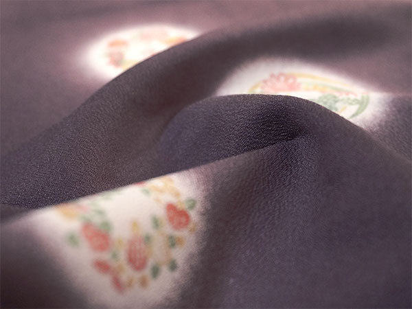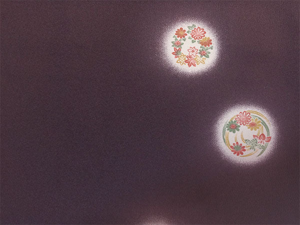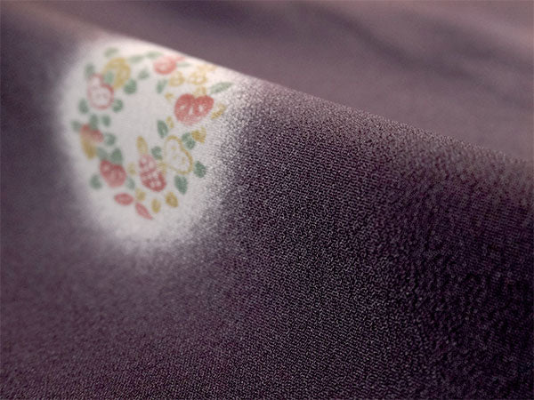 上品な渋紫地に、菊、笹、梅、紅葉、菖蒲、萩、橘など可憐な四季草花の丸が、ほわりと光るような白を纏って散らされています。 雰囲気を引き締めつつ重すぎないシックな色味で、細かいシボ感の縮緬地と相まって高級感があります。 |