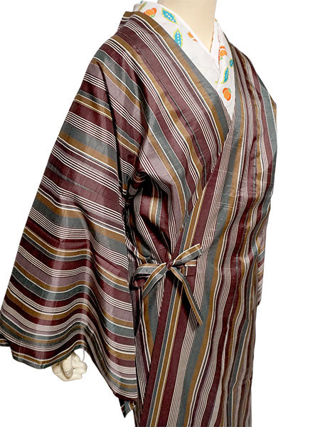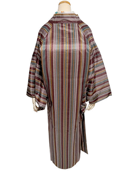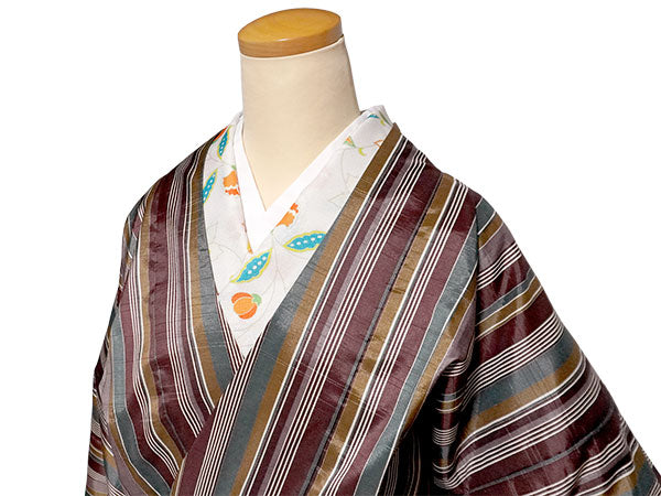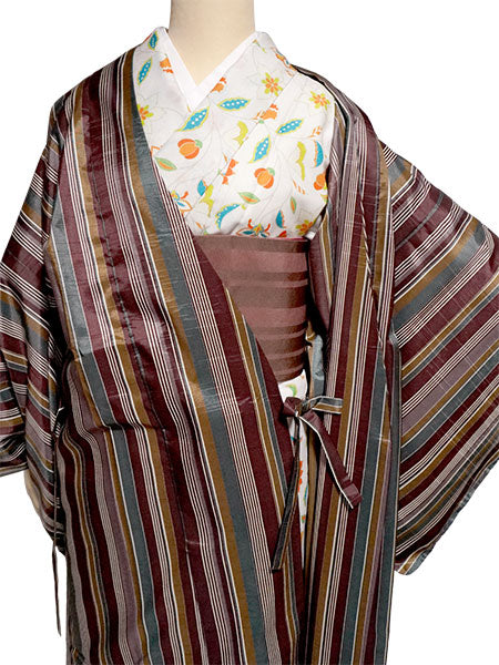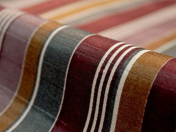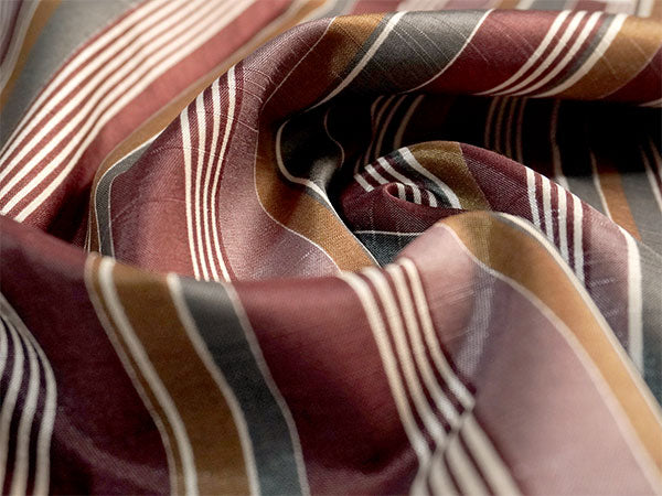 くすんだ赤茶、黄土、青緑などのアースカラーに、パキッとした白がアクセントになった矢鱈縞。ちょっとレトロで軽妙な雰囲気が小粋なコートです。 薄手でザラリとした光沢とシャリ感があり、横向きの織りの風合いがある生地感です。 |