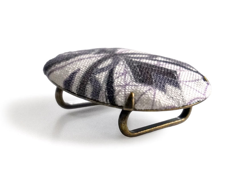 白地に黒のハンサムなオリエンタル柄です。 銀のラインや紫のアクセントが端正で大人っぽい印象に。 台座はオーバル形で、アンティーク調の鈍金色がクラシックな雰囲気です。 |