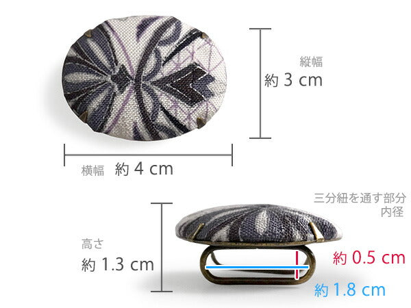 飾り部分: 横約4cm×縦約3cm×高さ約1.3cm(帯留金具含む) 帯締めを通す部分: 内径横約1.8cm×高さ約0.5cm |