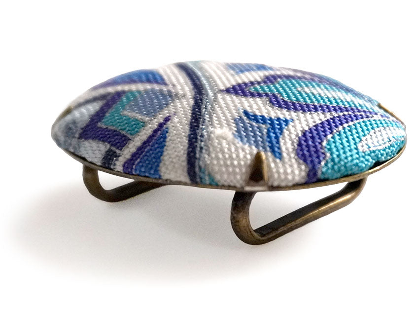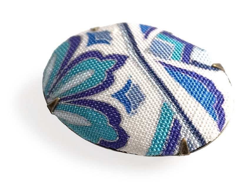 白地に青の爽やかなオリエンタル柄です。 さりげない銀のラインがきらめき、華やかで知的な印象に。 台座はオーバル形で、アンティーク調の鈍金色がクラシックな雰囲気です。 |