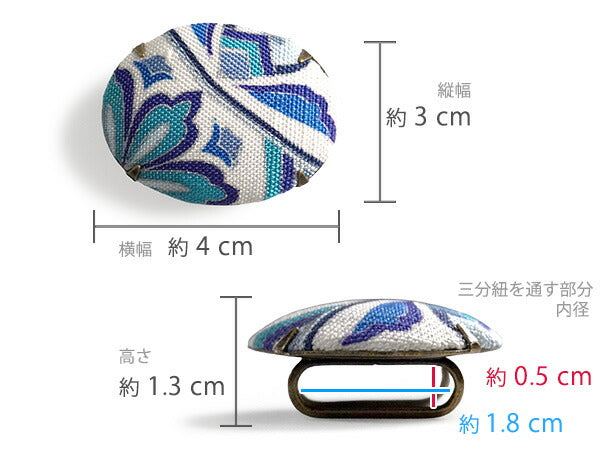 飾り部分: 横約4cm×縦約3cm×高さ約1.3cm(帯留金具含む) 帯締めを通す部分: 内径横約1.8cm×高さ約0.5cm |