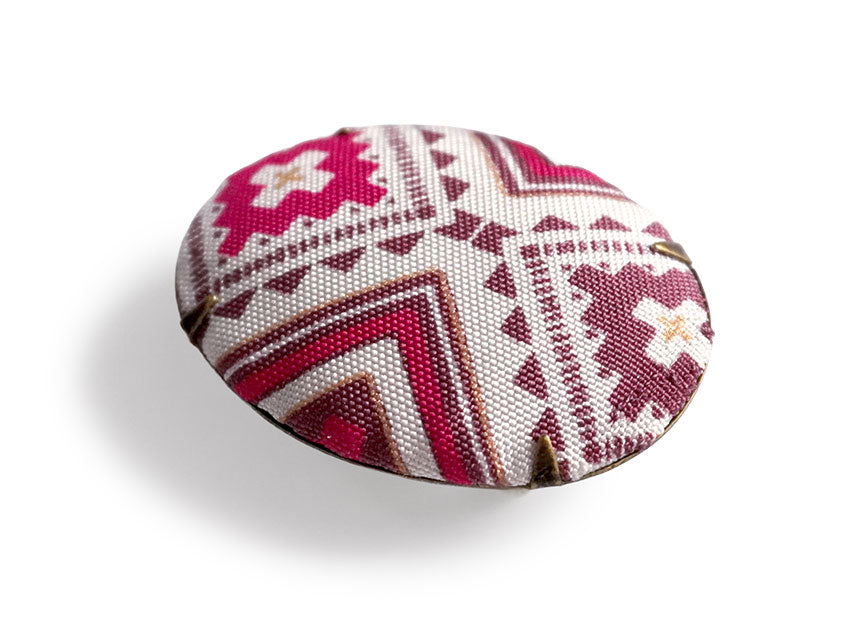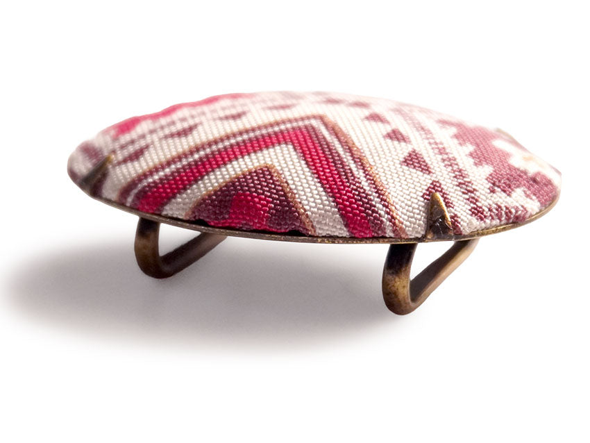 こっくりしたマゼンタとボルドーの、華やかなタイルのような幾何学柄です。 金の縁取りがアクセントになり、どこかエキゾチックな可愛らしさのある印象です。 台座はオーバル形で、アンティーク調の鈍金色がクラシックな雰囲気です。 |