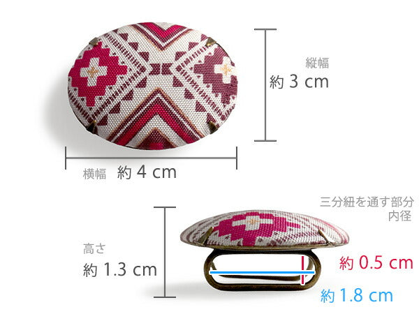 飾り部分: 横約4cm×縦約3cm×高さ約1.3cm(帯留金具含む) 帯締めを通す部分: 内径横約1.8cm×高さ約0.5cm |