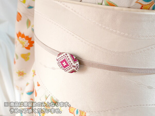 | 《帯留の使い方》 三分紐(さんぶひも)という細めの帯締めを通して使います。 三分紐は結んだら背中にくるっと回し、結びめはお太鼓の中に入れて隠しておきます。 浴衣帯に合わせたり、名古屋帯と合わせたり、 カジュアルなシーンでコーディネートをお楽しみいただけます。 |