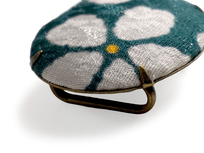 深い緑地にシンプル可愛い桜の柄です。 霰地紋の布地の美しい表情に、さりげなく散ったラメが楚々と輝き、特別感たっぷり。 台座はオーバル形で、アンティーク調の鈍金色がクラシックな雰囲気です。 |