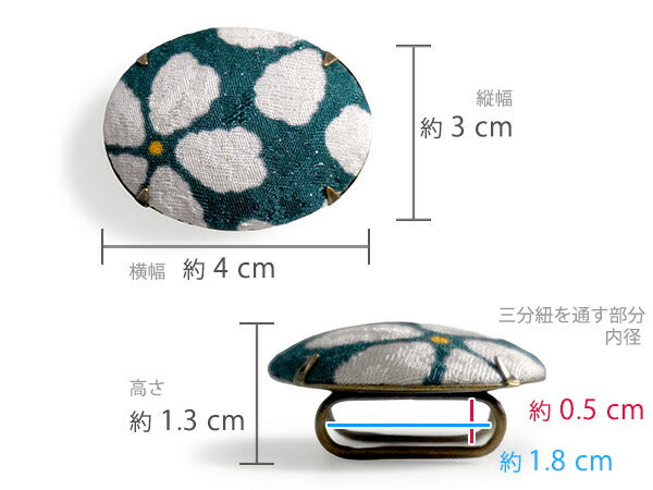 飾り部分: 横約4cm×縦約3cm×高さ約1.3cm(帯留金具含む) 帯締めを通す部分: 内径横約1.8cm×高さ約0.5cm |