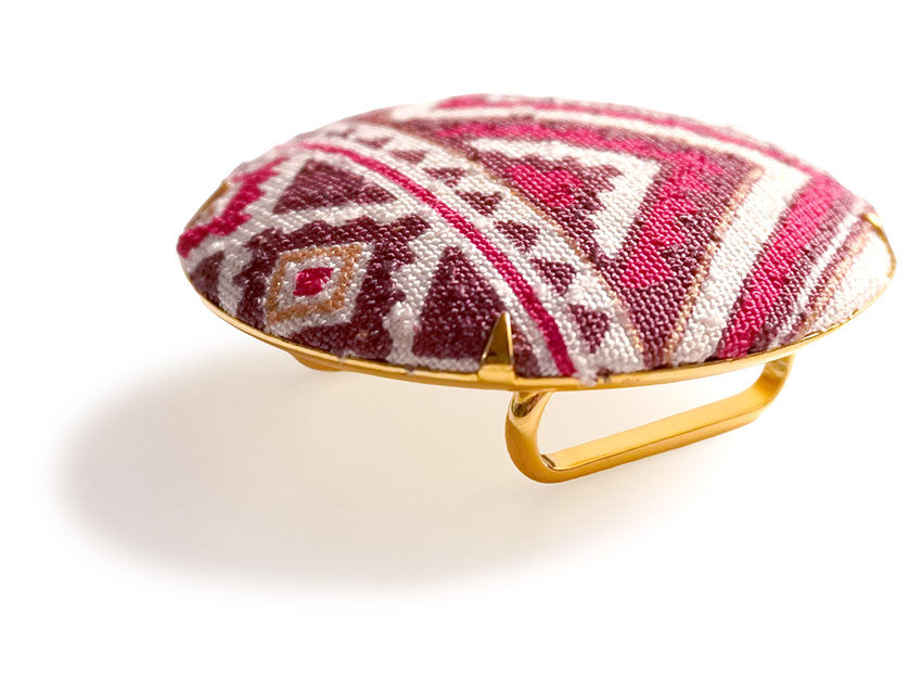 こっくりしたマゼンタとボルドーの、華やかなタイルのような幾何学柄です。 金の縁取りがアクセントになり、どこかエキゾチックな可愛らしさのある印象です。 台座はラウンド形で、明るいゴールドが若々しく華やかな雰囲気です。 |