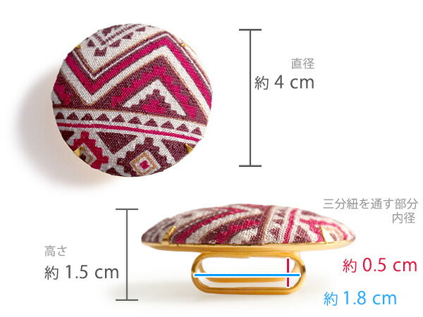 飾り部分: 直径約4cm×高さ約1.5cm(帯留金具含む) 帯締めを通す部分: 内径横約1.8cm×高さ約0.5cm |