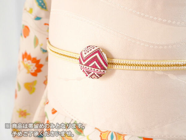 | 《帯留の使い方》 三分紐(さんぶひも)という細めの帯締めを通して使います。 三分紐は結んだら背中にくるっと回し、結びめはお太鼓の中に入れて隠しておきます。 浴衣帯に合わせたり、名古屋帯と合わせたり、 カジュアルなシーンでコーディネートをお楽しみいただけます。 |