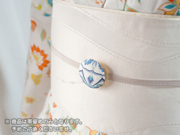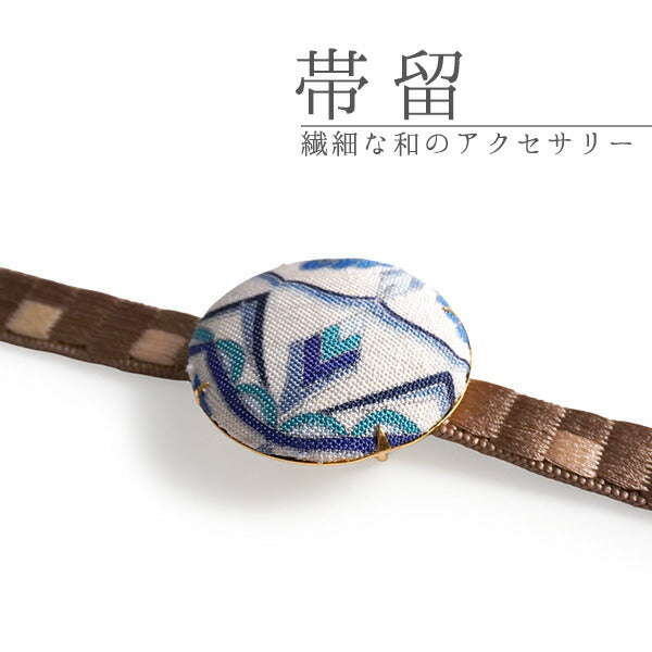| 《帯留の使い方》 三分紐(さんぶひも)という細めの帯締めを通して使います。 三分紐は結んだら背中にくるっと回し、結びめはお太鼓の中に入れて隠しておきます。 浴衣帯に合わせたり、名古屋帯と合わせたり、 カジュアルなシーンでコーディネートをお楽しみいただけます。 |