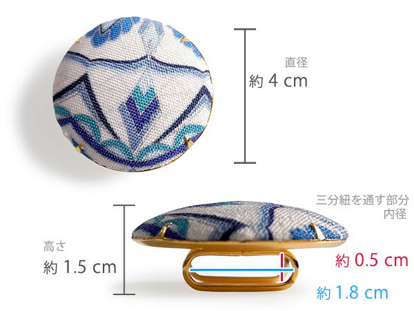 飾り部分: 直径約4cm×高さ約1.5cm(帯留金具含む) 帯締めを通す部分: 内径横約1.8cm×高さ約0.5cm |