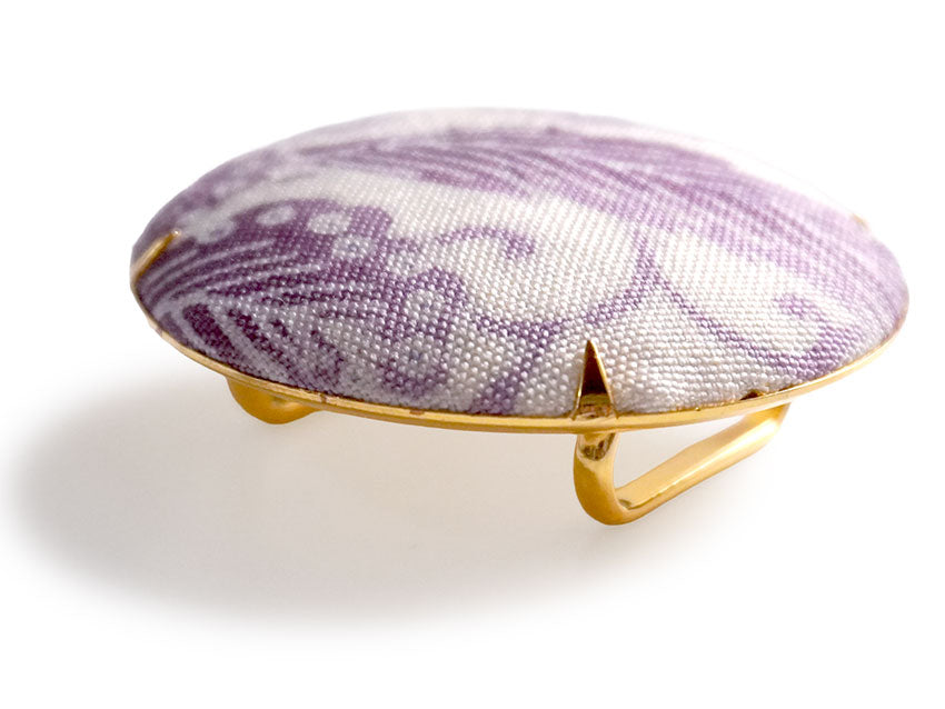 白地に薄紫の華やかな更紗柄です。 ニュアンスに富んだ色合いが、柔らかでフェミニンな印象。 台座はラウンド形で、明るいゴールドが若々しく華やかな雰囲気です。 |