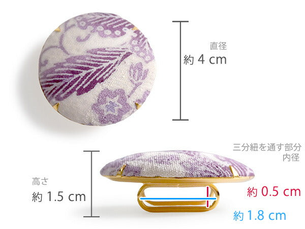 飾り部分: 直径約4cm×高さ約1.5cm(帯留金具含む) 帯締めを通す部分: 内径横約1.8cm×高さ約0.5cm |