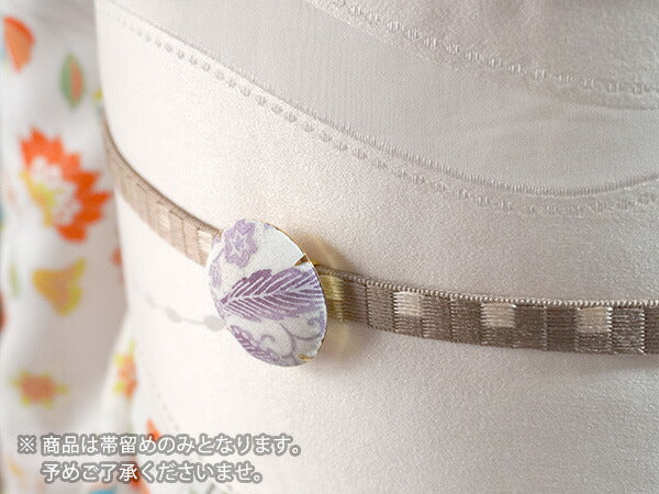 | 《帯留の使い方》 三分紐(さんぶひも)という細めの帯締めを通して使います。 三分紐は結んだら背中にくるっと回し、結びめはお太鼓の中に入れて隠しておきます。 浴衣帯に合わせたり、名古屋帯と合わせたり、 カジュアルなシーンでコーディネートをお楽しみいただけます。 |