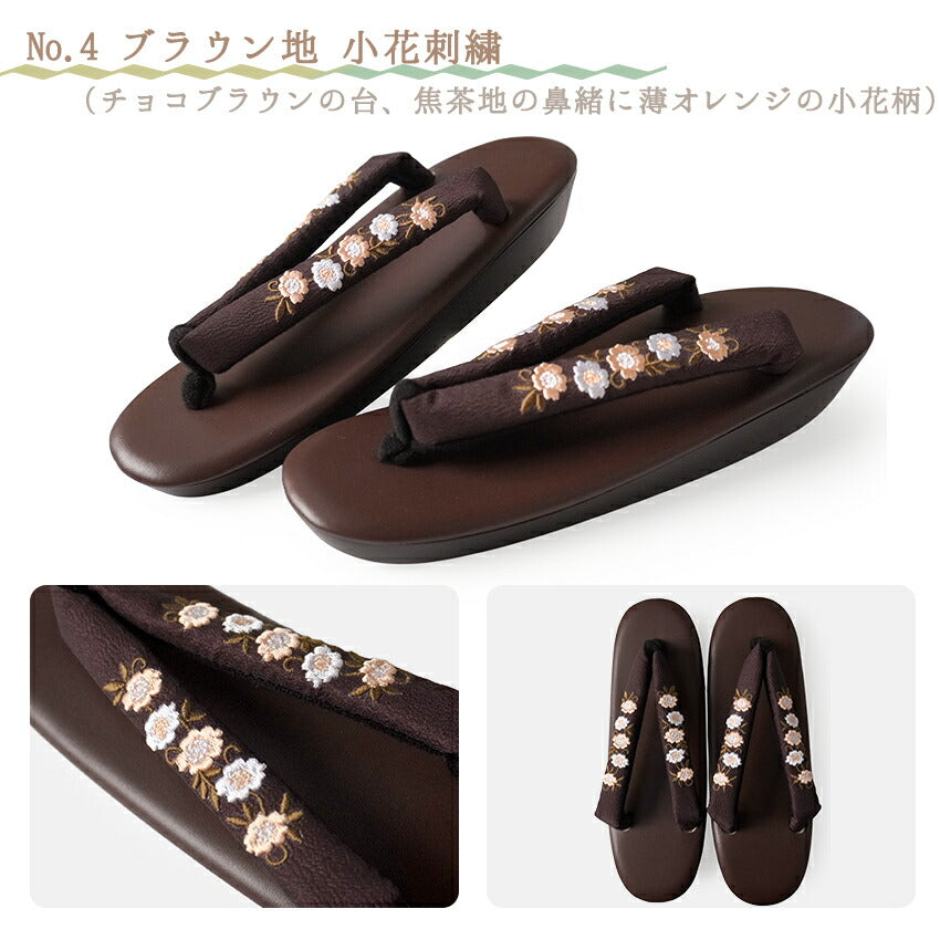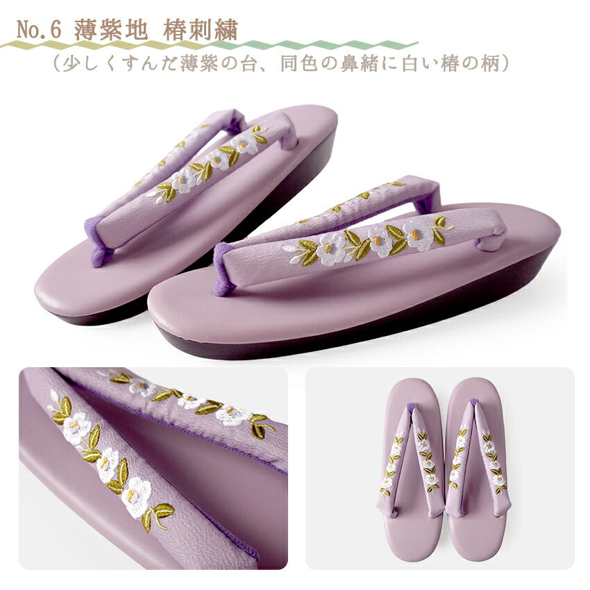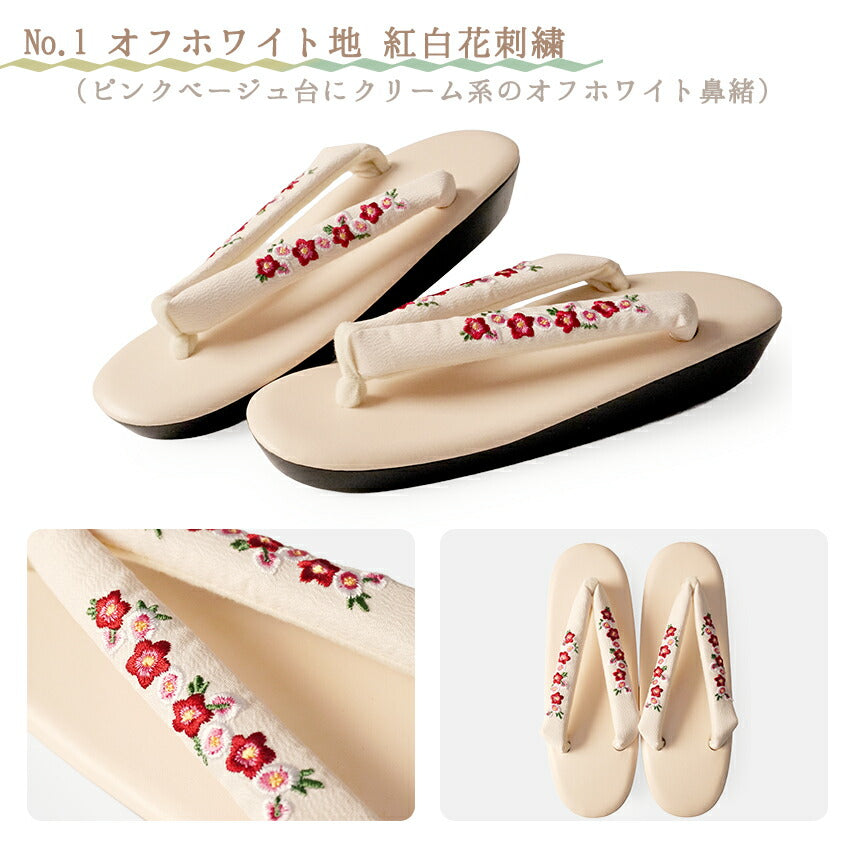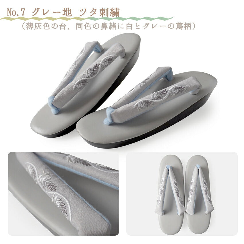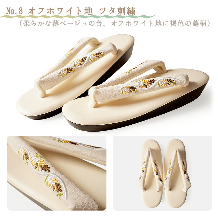 No.1 オフホワイト地紅白花刺繍 (台)ピンク系ベージュ (鼻緒)オフホワイト地に紅白花柄 No.2 黒地紅白花刺繍 (台)ブラック (鼻緒)黒地に紅白花柄 No.3 オフホワイト地小花刺繍 (台)クリーム系白 (鼻緒)白地にピンクの小花柄 No.4 ブラウン地小花刺繍 (台)茶色 (鼻緒)焦茶地に白と薄オレンジの小花柄 No.5 アイボリー地椿刺繍 (台)くすみベージュ (鼻緒)生成地に白の椿柄 No.6 薄紫地椿刺繍 (台)薄紫色 (鼻緒)薄紫地に白の椿柄 No.7 グレー地ツタ刺繍 (台)明灰色 (鼻緒)明灰色に白とグレーの蔦柄 No.8 オフホワイト地ツタ刺繍 (台)ライトベージュ (鼻緒)オフホワイト地に白とカーキ系の蔦柄 |