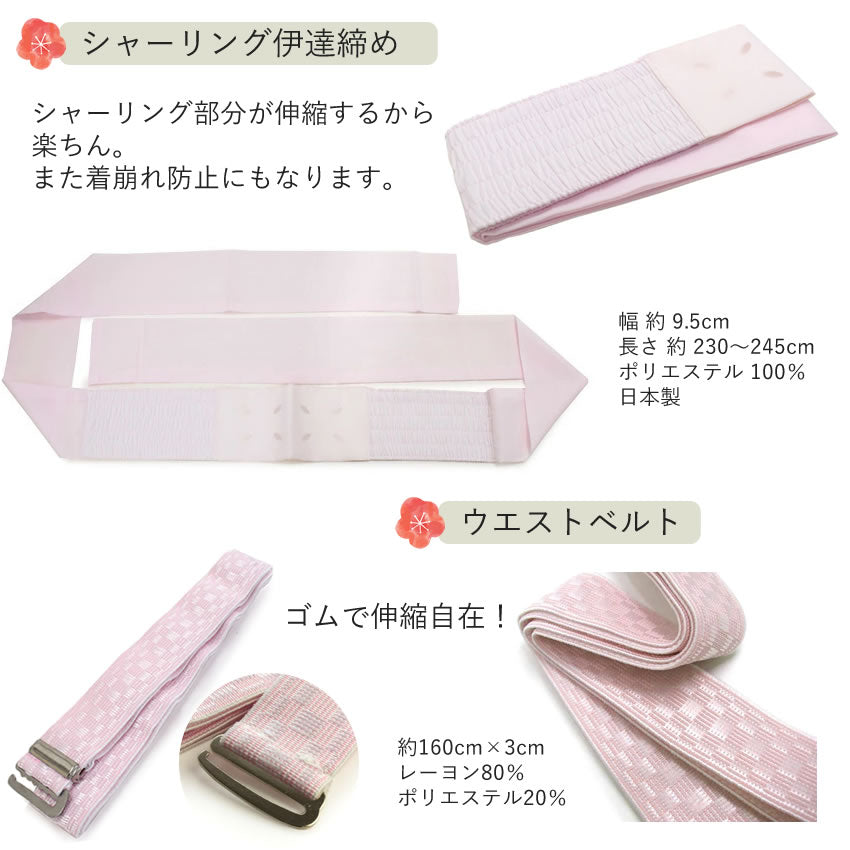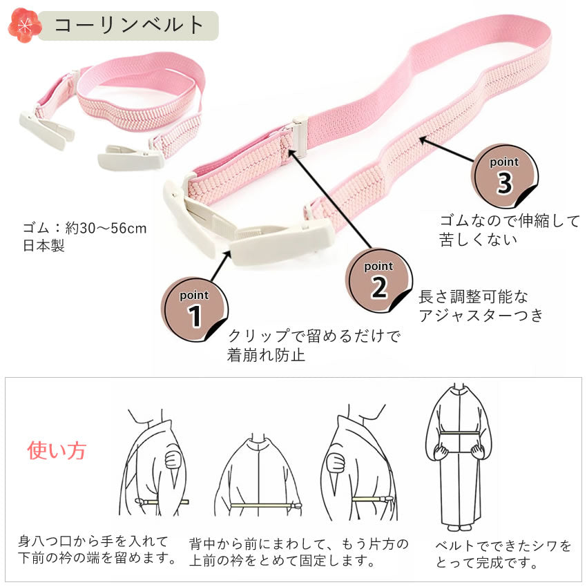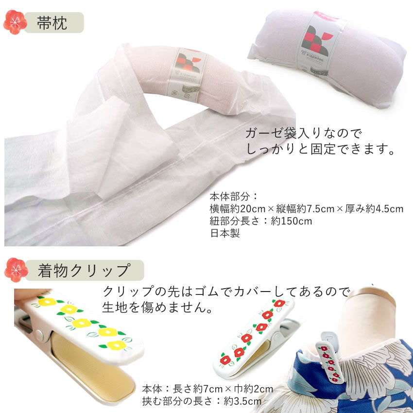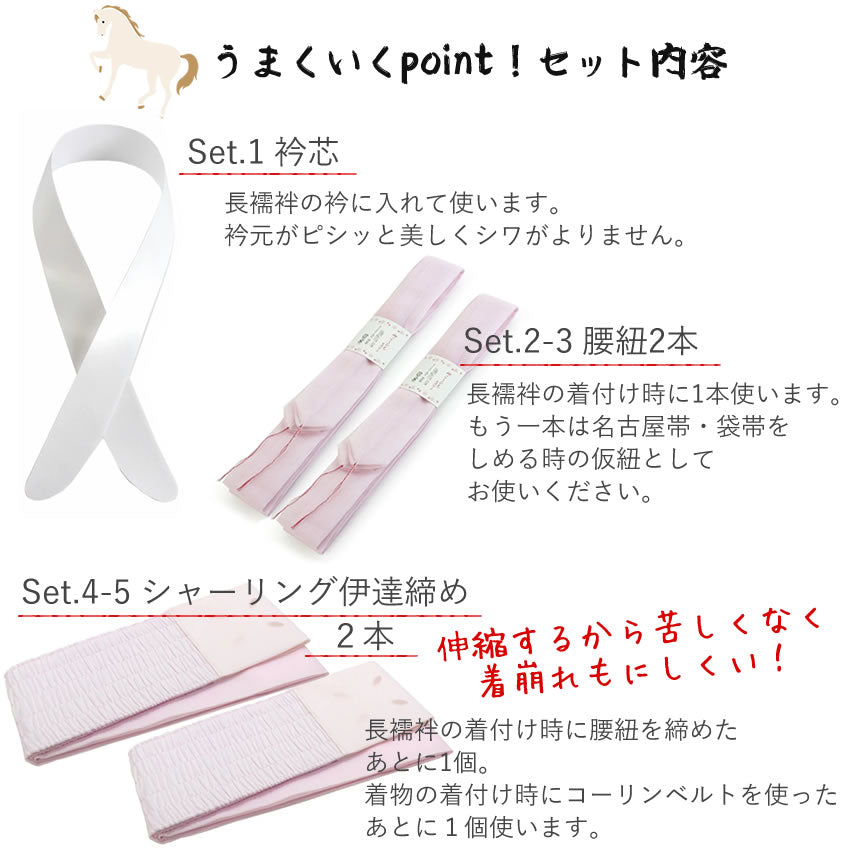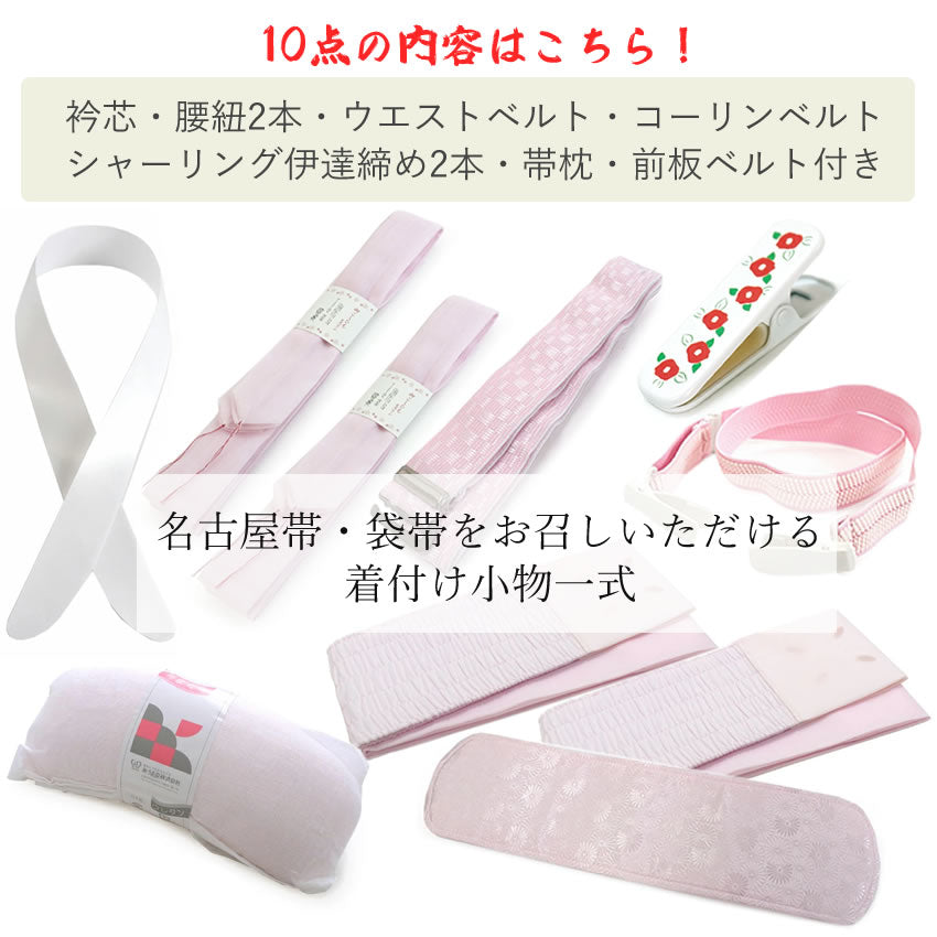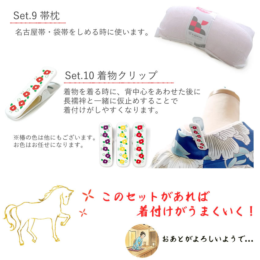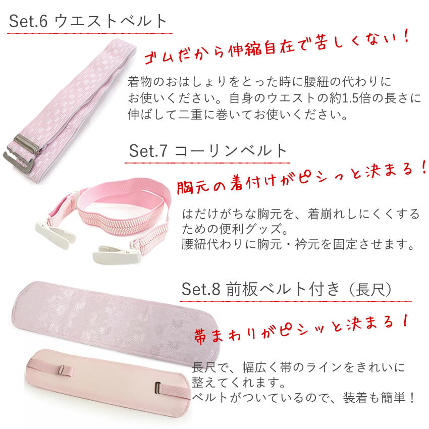【10点セット】 ・衿芯 ・腰紐2本 ・ウエストベルト ・着物クリップ ・コーリンベルト ・シャーリング伊達締め2本 ・ガーゼ帯枕 ・前板ベルト付き |