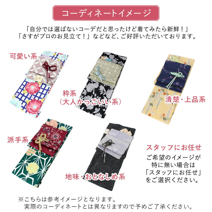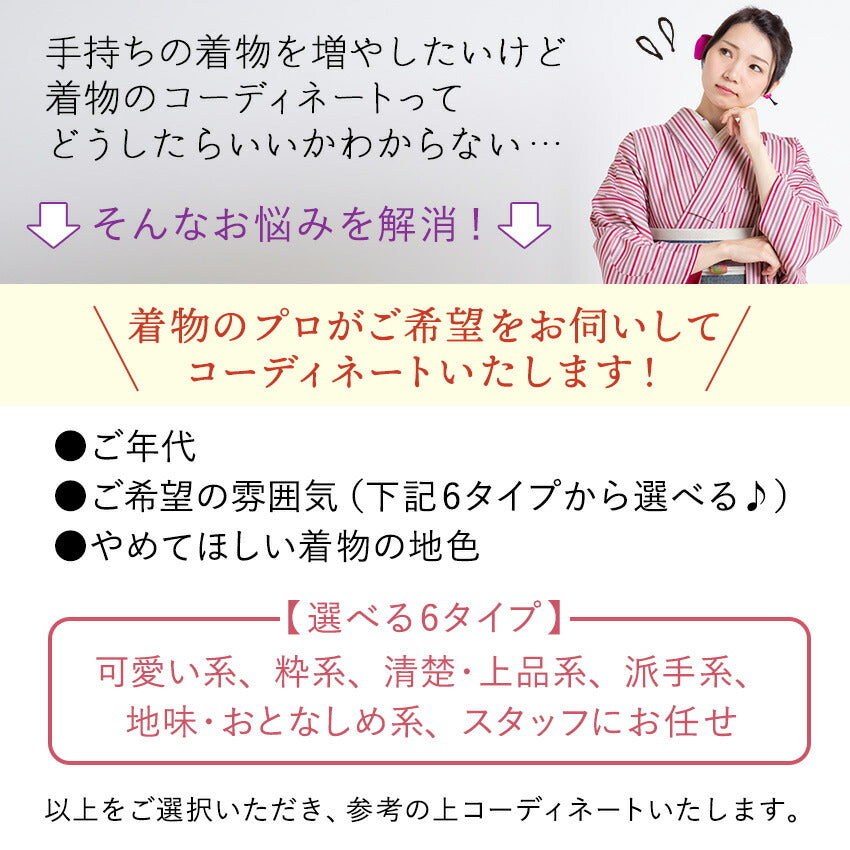 着物・帯・帯揚げ・帯締めの色柄は、ご希望の雰囲気に合わせて当店がコーディネートさせていただきます。 ご注文の際、下記から該当する項目をコピー&ペーストする等して備考欄にご記入下さい。 ◆ご年代 20歳代・30歳代・40歳代・50歳代・60歳以上 ◆ご希望のセット雰囲気 可愛い系・粋系・清楚上品系・派手系・地味系・お任せ ◆着物の色系統 黒系・クリーム、ベージュ系・紫系・ピンク系・お任せ ◆着物の柄について 動物柄が入っていてもOK・動物柄はNG |
