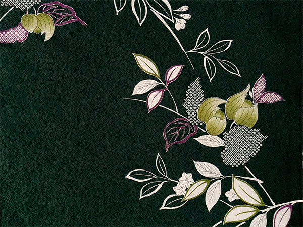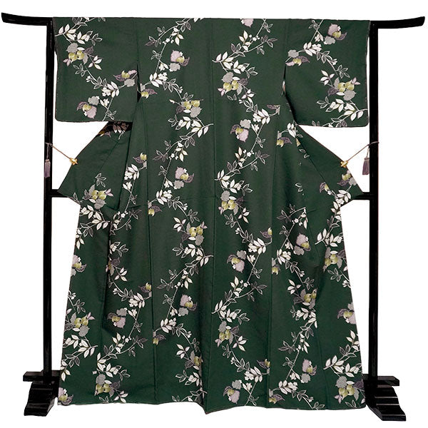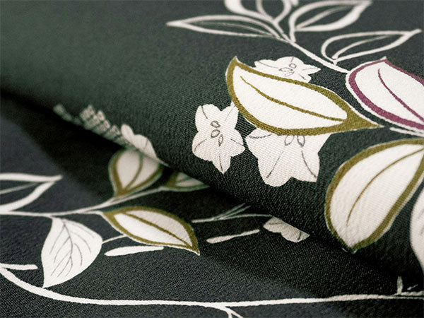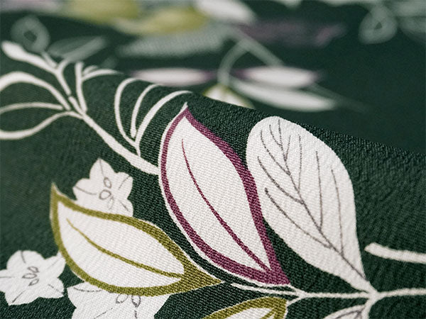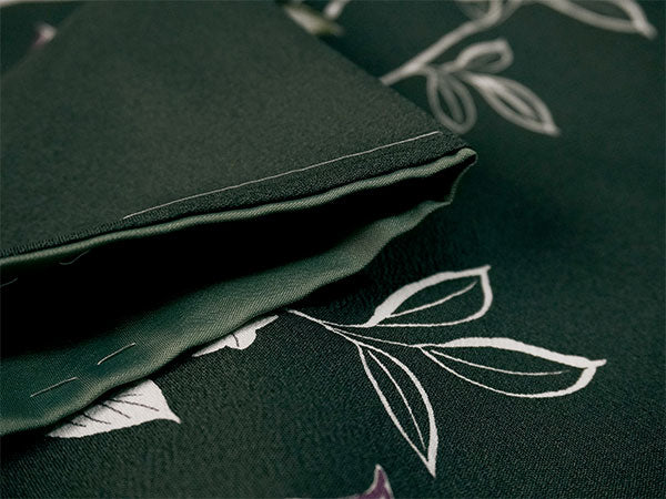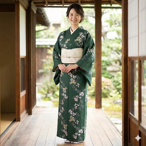 深い渋緑地に、木蓮などの花枝が流れるような筆書きで描かれています。抹茶色・渋紫の挿し色やの鹿の子模様が程よく華を添え、洗練された大人の和の雰囲気です。 生地はテイジン素材の縮緬地で、高級感があります。 八掛の色:抹茶色 ※画像と柄の出方が異なる場合がございます。予めご了承くださいませ。 ※着用画像はAIによるイメージ画像です。 |