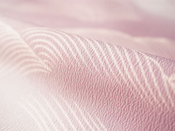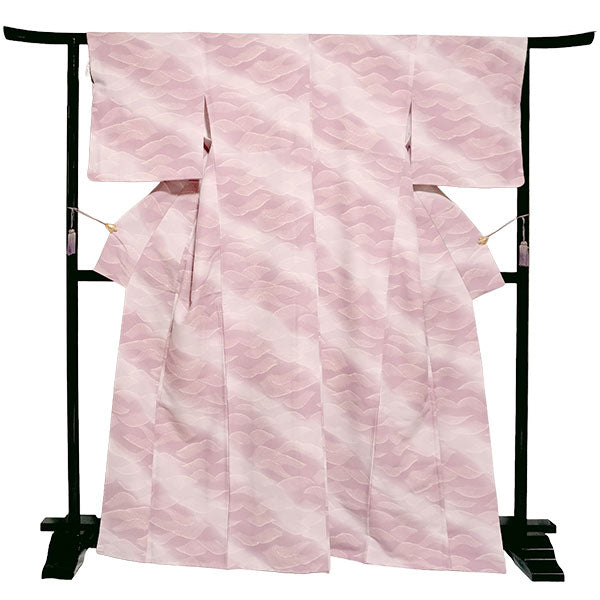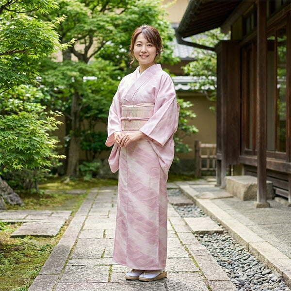 ゆらぐような淡いピンクの暈し地に、上品な波頭の意匠が全体に描かれた美しい柄ゆきです。可憐で透明感のある雰囲気です。 生地はテイジン素材の縮緬地で、高級感があります。 八掛の色:くすみピンク ※画像と柄の出方が異なる場合がございます。予めご了承くださいませ。 ※着用画像はAIによるイメージ画像です。 |